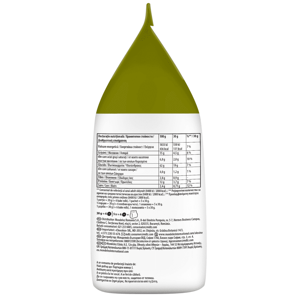 Αρτοσκευάσματα με γεύση ντομάτα, ελιά και ρίγανη. Συστατικά: Αλεύρι ΣΙΤΟΥ, φοινικέλαιο, γλουτένη ΣΙΤΟΥ, ζάχαρη, ιωδιούχο αλάτι, μαγιά, ορός ΓΑΛΑΚΤΟΣ σε σκόνη, γαλακτωματοποιητής (στεατόϋλο-2-γαλακτυλικό νάτριο), εκχύλισμα μαγιάς, γλυκόζη, αλεύρι φασολιών, σκόρδο σε σκόνη, κρεμμύδι σε σκόνη, τομάτα σε σκόνη (0,1%), αρωματική ύλη, βότανα, συμπυκνωμένος χυμός παντζαριού, χρωστική (εκχύλισμα πάπρικας), ελιές (0,04%), μέσο οξίνισης (κιτρικό οξύ), βελτιωτικά αλεύρου (ασκορβικό οξύ, L-κυστεΐνη), ρίγανη (0,01%), άμυλο ΣΙΤΟΥ.Αλλεργιογόνα
