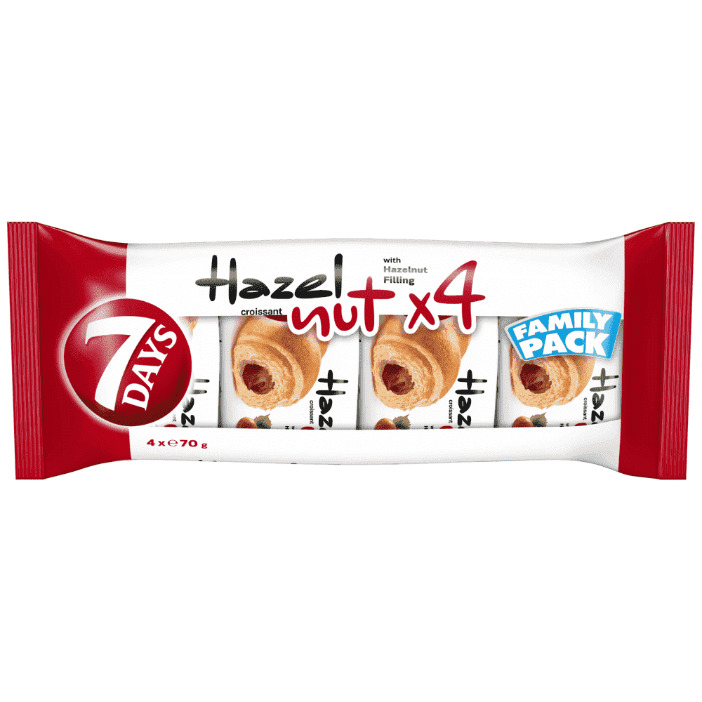 7DAYS κρουασάν με γέμιση πραλίνας φουντουκιού, σε πολυσυσκευασία. Ιδανικό για ένα γρήγορο σνακ ή ένα γλυκό πρωινό.