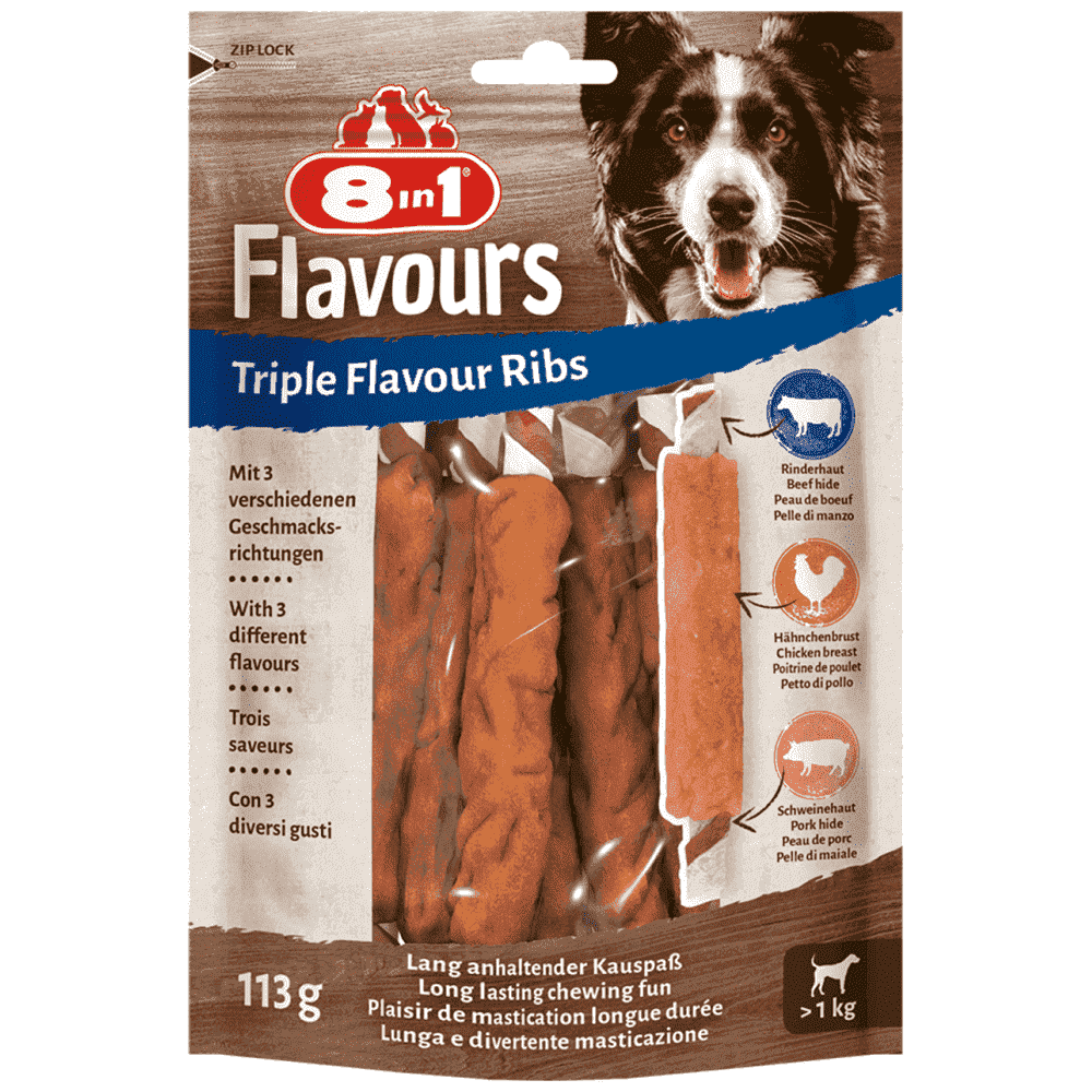 Τα 8in1 Triple Flavour Ribs συνδυάζουν τρεις υπέροχες γεύσεις από δέρμα χοιρινού και μοσχάρι, τυλιγμένο σε στήθος κοτόπουλου. Αυτά τα μασώμενα Παϊδάκια μακράς διαρκείας βοηθούν στον έλεγχο της πέτρας και της συσσώρευσης πλάκας λόγω της φυσικής λειαντικής τους δράσης κατά τη μάσηση. Είναι πλούσια σε πρωτεΐνες, χαμηλά σε λιπαρά και δεν περιέχουν πρόσθετη ζάχαρη, βελτιωτικά γεύσης και τεχνητά συντηρητικά, καθιστώντας τα την ιδανική ανταμοιβή ή σνακ για σκύλους όλων των μεγεθών. Επιπλέον, δεν περιέχουν GMO και ψήνονται στο φούρνο, γεγονός που όχι μόνο βοηθά στη μακροχρόνια διάρκεια τους, αλλά και στη διατήρηση των πολύτιμων θρεπτικών συστατικών.