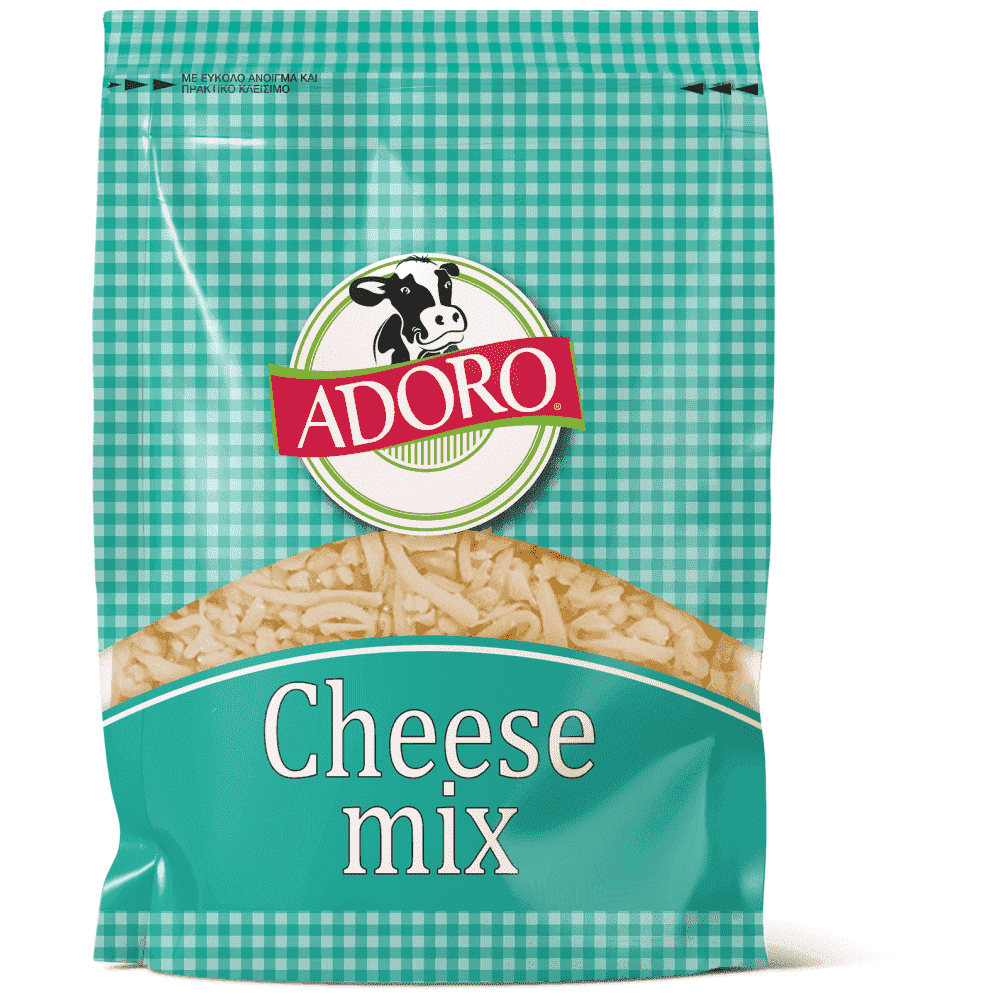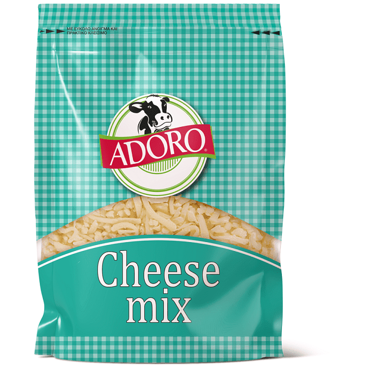 Το Adoro Cheese Mix φτιάχνεται από μίγμα εκλεκτών ημίσκληρων τυριών Adoro Emmental, Edam, Mozzarella και κίτρινο τυρί light, τα οποία χαρίζουν στα πιάτα σας μοναδική γεύση και σε εσάς ξεχωριστή απόλαυση. Αποτελεί την ιδανική λύση για την πολυάσχολη νοικοκυρά που δεν έχει την πολυτέλεια του χρόνου να τρίβει διαφορετικά τυριά ώστε να φτιάξει το αγαπημένο της σουφλέ ή πίτσα.