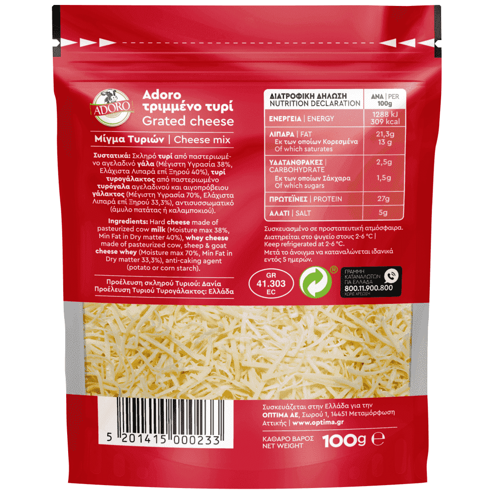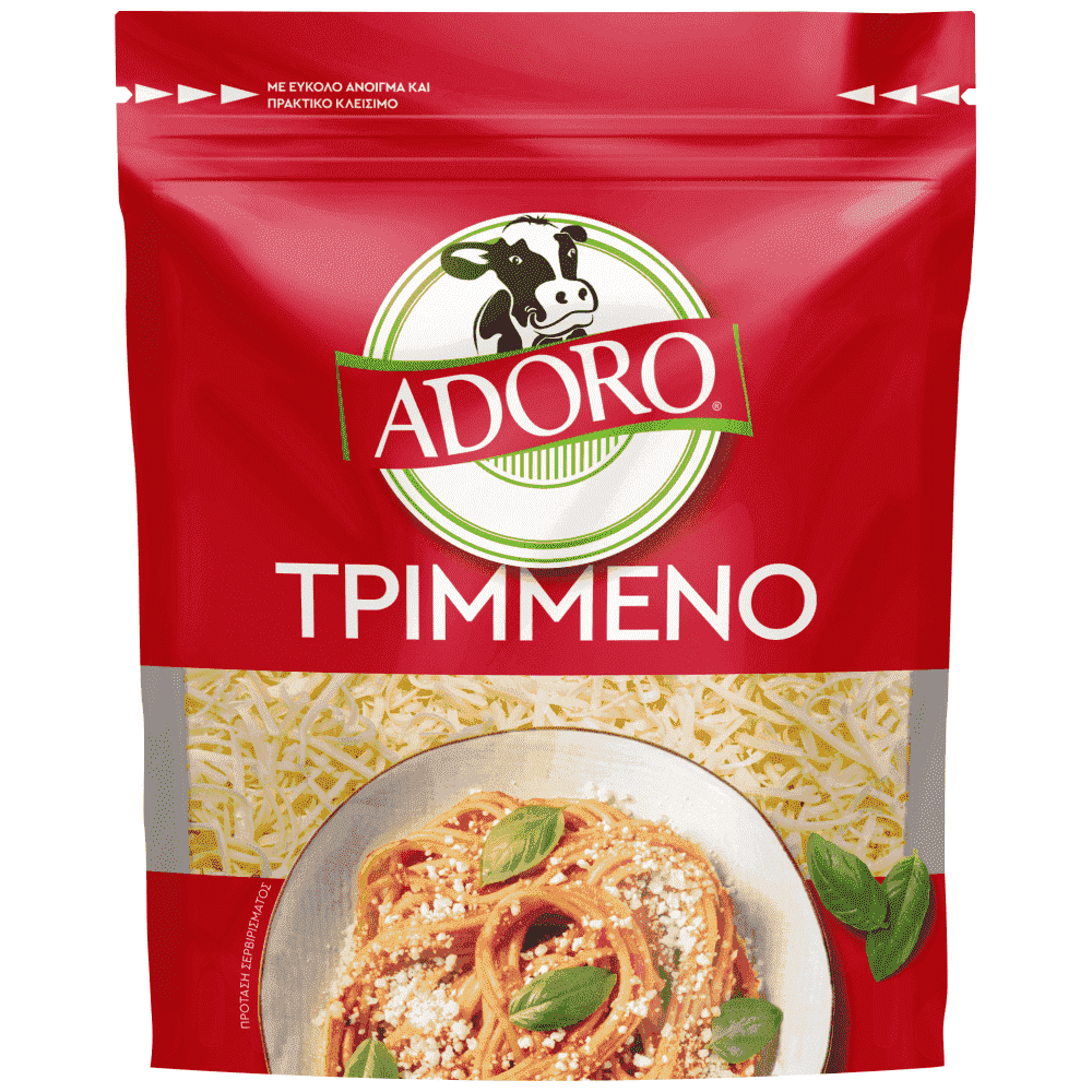 Το Adoro τριμμένο φτιάχνεται από εκλεκτό σκληρό τυρί, το οποίο χαρίζει στα πιάτα σας μοναδική γεύση και σε εσάς ξεχωριστή απόλαυση. Συνοδεύει άριστα τα ζυμαρικά σας, καθώς μπαίνει από πάνω δίνοντάς τους μία παραπάνω γευστική πινελιά.