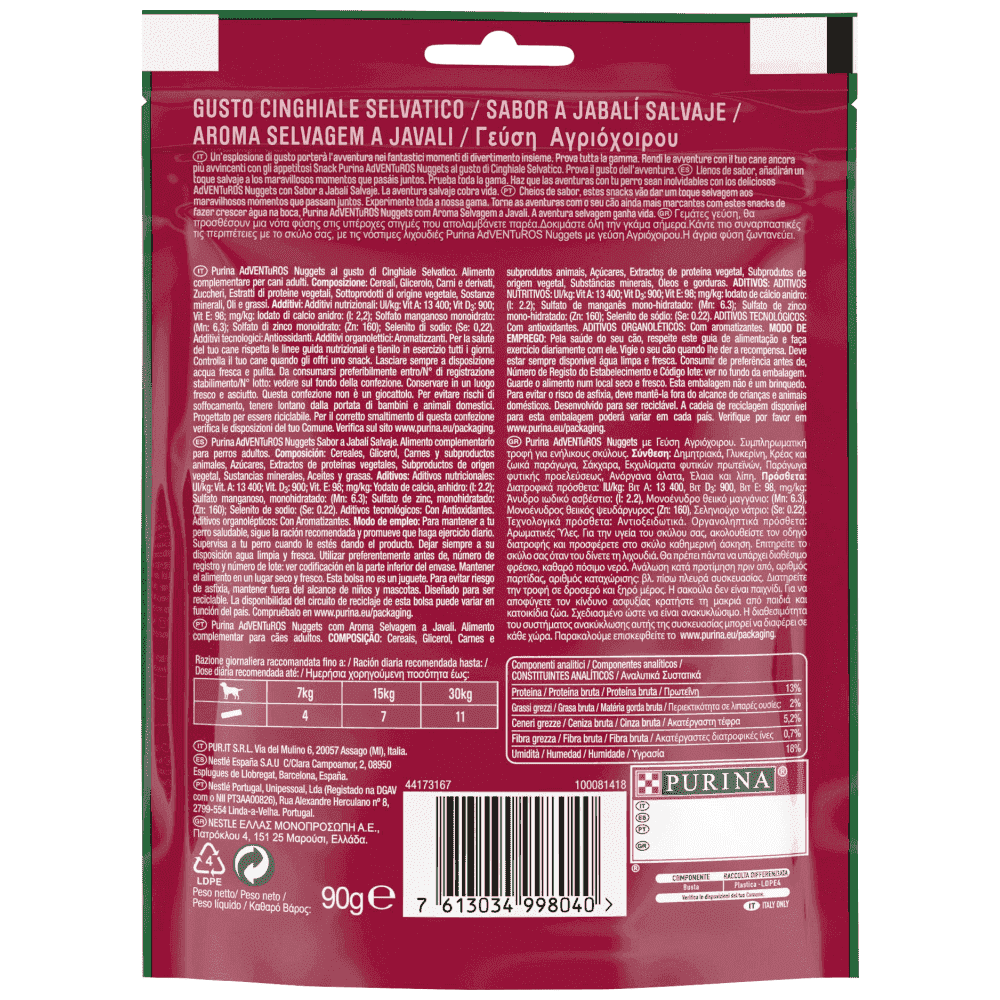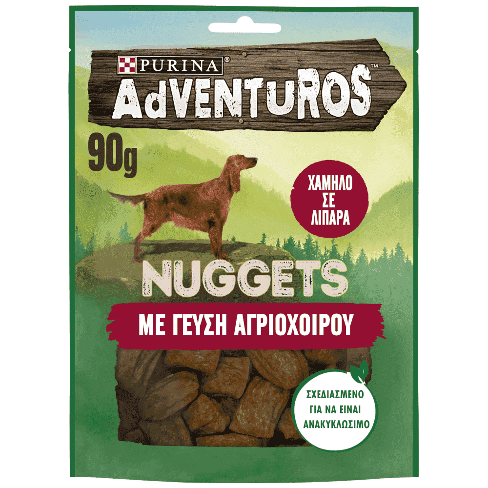 Λαχταριστά Nuggets για σκύλους με έμφυτη αίσθηση της περιπέτειας! ADVENTUROS Nuggets με Αγριόχοιρο 90g σκύλους. Γεμάτες γεύση, θα προσθέσουν μια νότα φύσης στις υπέροχες στιγμές που απολαμβάνετε παρέα.Δοκιμάστε όλη την γκάμα σήμερα.Κάντε πιο συναρπαστικές τις περιπέτειες με το σκύλο σας, με τις νόστιμες λιχουδιές Purina AdVENTuROS Nuggets με γεύση Αγριόχοιρου.Purina AdVENTuROS Nuggets με γεύση Αγριόχοιρου.Η άγρια φύση ζωντανεύει. Δοκιμάστε μια περιπέτεια άγριας γεύσης. Σχεδιασμένο ώστε να είναι ανακυκλώσιμο.Η διαθεσιμότητα του συστήματος ανακύκλωσης αυτής της συσκευασίας μπορεί να διαφέρει σε κάθε χώρα.Παρακαλούμε επισκεφθείτε το www.purina.eu/packaging.