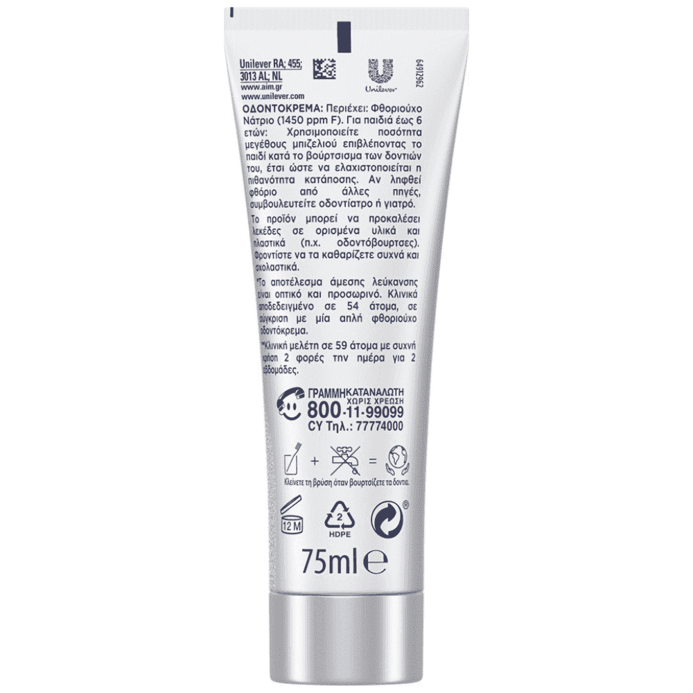 *Το αποτέλεσμα άμεσης λεύκανσης είναι οπτικό και προσωρινό. Κλινικά αποδεδειγμένο σε 54 άτομα, σε σύγκριση με μία απλή φθοριούχο οδοντόκρεμα. **Κλινική μελέτη σε 59 άτομα με συχνή χρήση 2 φορές την ημέρα για 2 εβδομάδες.