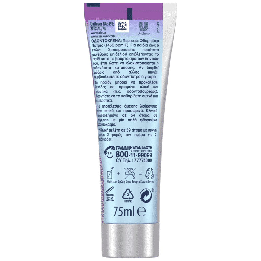 *Το αποτέλεσμα άμεσης λεύκανσης είναι οπτικό και προσωρινό. Κλινικά αποδεδειγμένο σε 54 άτομα, σε σύγκριση με μία απλή φθοριούχο οδοντόκρεμα. **Κλινική μελέτη σε 59 άτομα με συχνή χρήση 2 φορές την ημέρα για 2 εβδομάδες.