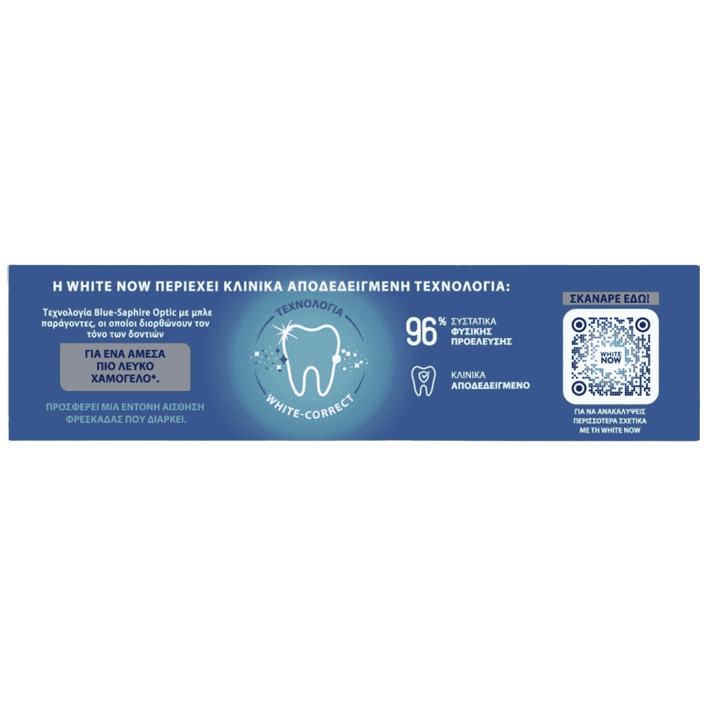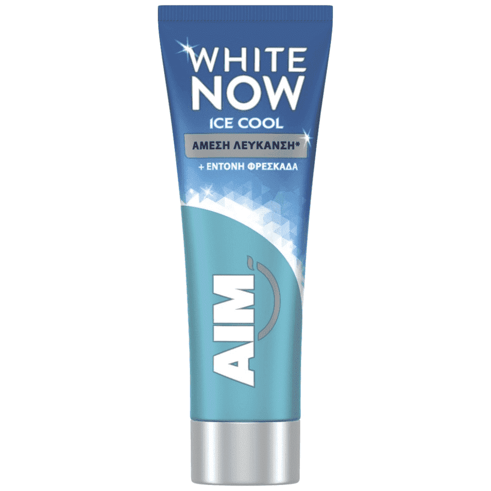 Η AIM White NOW Ice Cool περιέχει κλινικά αποδεδειγμένη τεχνολογία White-correct: Τεχνολογία Blue-Saphire Optic με μπλε παράγοντες, οι οποίοι διορθώνουν τον τόνο των δοντιών για ένα άμεσα πιο λευκό χαμόγελο*. Προσφέρει μια έντονη αίσθηση φρεσκάδας που διαρκεί. Κλινικά αποδεδειγμένο. 96% συστατικά φυσικής προέλευσης *Το αποτέλεσμα άμεσης λεύκανσης είναι οπτικό και προσωρινό. Κλινικά αποδεδειγμένο σε 54 άτομα, σε σύγκριση με μία απλή φθοριούχο οδοντόκρεμα. Το προϊόν μπορεί να προκαλέσει λεκέδες σε ορισμένα υλικά και πλαστικά (π.χ. οδοντόβουρτσες). Βεβαιωθείτε ότι τα καθαρίζετε τακτικά και σχολαστικά.