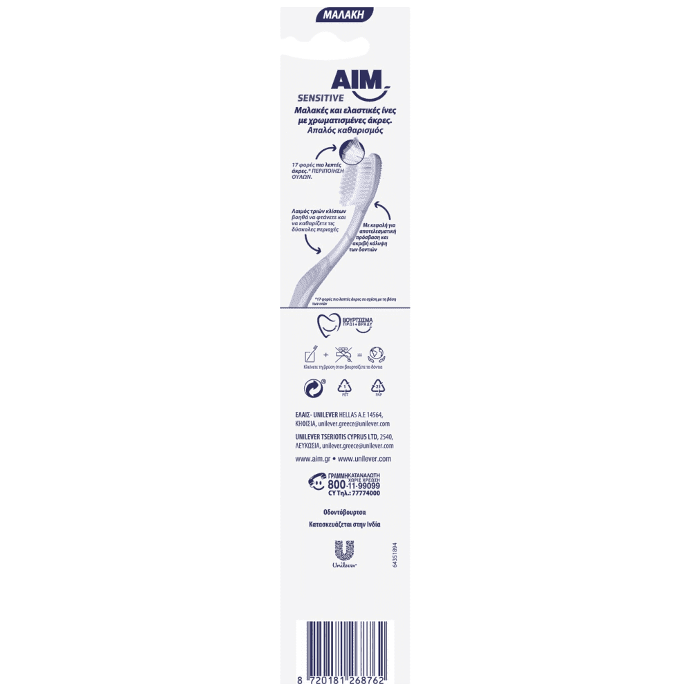 Η AIM SensiSoft Sensitive Μαλακή με 17 φορές πιο λεπτές άκρες* για φροντίδα των ούλων. Μαλακές και ελαστικές ίνες με χρωματισμένες άκρες. Απαλός καθαρισμός. 17 φορές πιο λεπτές άκρες* Περιποίηση των ούλων, Λαιμός τριών κλίσεων, βοηθά να φτάνετε και να καθαρίζετε τις δύσκολες περιοχές, Με κεφαλή για αποτελεσματική πρόσβαση και ακρίβη κάλυψη των δοντιών. *17 φορές πιο λεπτές άκρες σε σχέση με την βάση των ινών.