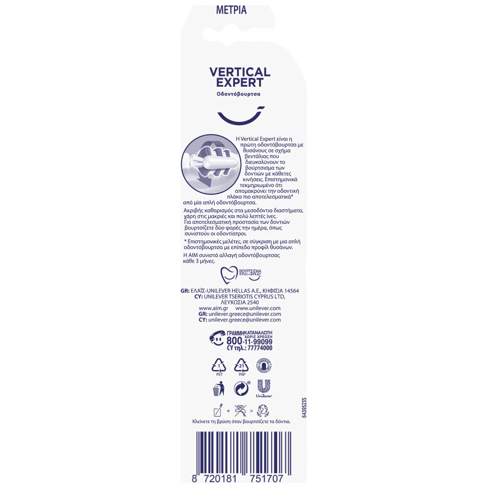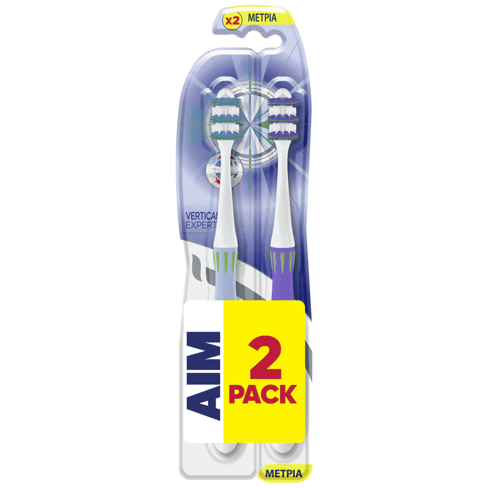 Η ΑΙΜ Vertical Expert είναι η πρώτη οδοντόβουρτσα με θυσάνους σε σχήμα βεντάλιας που διευκολύνουν το βούρτσισμα των δοντιών με κάθετες κινήσεις. Επιστημονικά τεκμηριωμένο ότι απομακρύνει την οδοντική πλάκα πιο αποτελεσματικά* από μια απλή οδοντόβουρτσα. Προσφέρει ακριβή καθαρισμό στα μεσοδόντια διαστήματα, χάρη στις μακριές και πολύ λεπτές ίνες. Για αποτελεσματική προστασία των δοντιών βουρτσίζετε δύο φορές την ημέρα, όπως συνιστούν οι οδοντίατροι.*Επιστημονικές μελέτες, σε σύγκριση με μια απλή οδοντόβουρτσα με επίπεδο προφίλ θυσάνων.