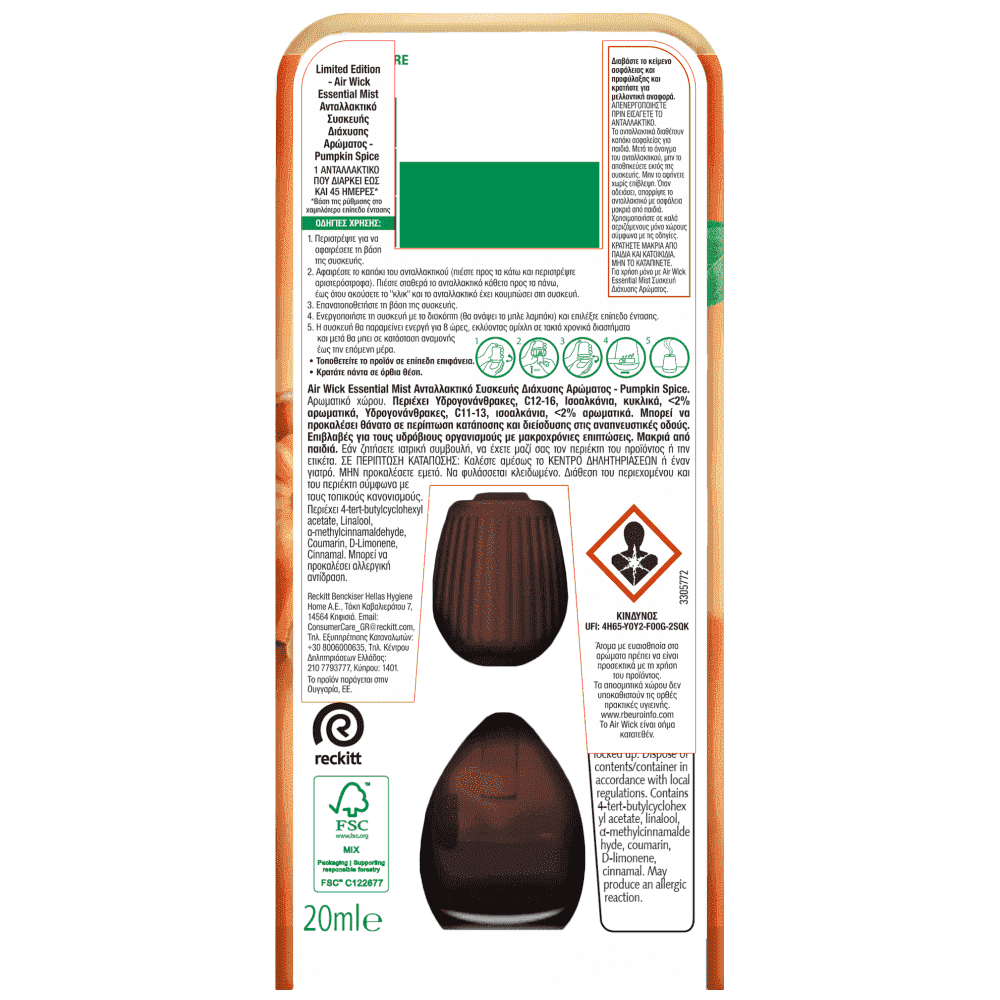 "Η νέα συσκευή Airwick Essential Mist μεταμορφώνει τα φυσικά αιθέρια έλαια σε διακριτικό και ντελικάτο αρωματισμό σε μορφή ατμού. Δημιουργήστε στο σπίτι σας ατμόσφαιρα ηρεμίας και ευεξίας επιλέγοντας ένα από τα διαθέσιμα αρώματα της συλλογής: παιώνια-γιασεμί, λεβάντα, λεμόνι-θυμάρι,πορτοκάλι-μανταρίνι, βανίλια-άνθη κερασιάς. Διαλέξτε αυτό που σας ταιριάζει και αφήστε τη δύναμη των αιθέριων ελαίων να σας ταξιδέψει."