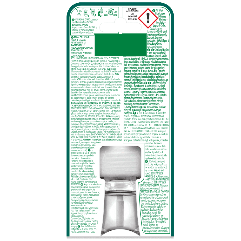 "Χρησιμοποιείτε μόνο με Air Wick ή Botanica by Air Wick ηλεκτρική συσκευή. ΔΙΑΒΑΣΤΕ ΤΙΣ ΟΔΗΓΙΕΣ ΑΣΦΑΛΕΙΑΣ ΚΑΙ ΠΡΟΦΥΛΑΞΗΣ - ΚΡΑΤΗΣΤΕ ΓΙΑ ΜΕΛΛΟΝΤΙΚΗ ΑΝΑΦΟΡΑ.