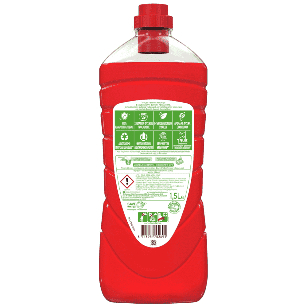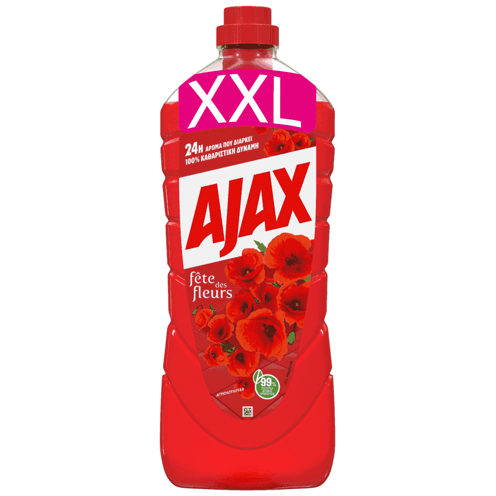 Το Ajax Fete des Fleurs Αγριολούλουδα Υγρό Καθαριστικό Πατώματος προσφέρει έντονο άρωμα φρεσκάδας, που διαρκεί 24 ώρες. Το Ajax πολυκαθαριστικό προσφέρει 100% καθαριστική δύναμη.