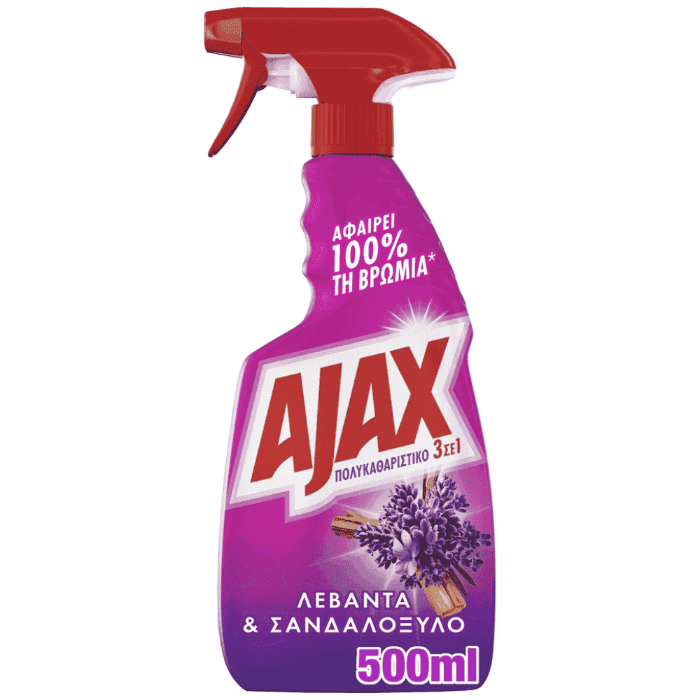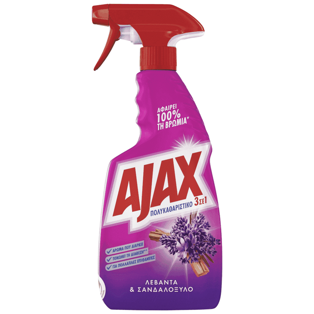 Νέο Ajax 3 ΣΕ 1 Relaxing πολυκαθαριστικό σπρέι για πολλαπλές επιφάνειες και χρήσεις. Με χαλαρωτικό άρωμα Λεβάντας και Σανδαλόξυλου σχεδιασμένο να επιδρά θετικά στη διάθεσή σας.