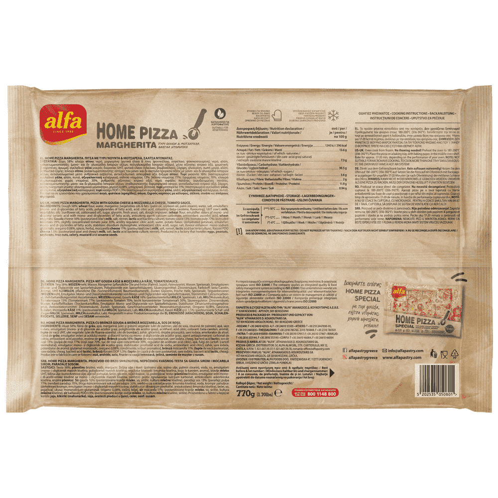 Ζύμη 58%: αλεύρι ΣΙΤΟΥ, νερό, μαργαρίνη: [φυτικά έλαια & λίπη: (φοινικέλαιο, σογιέλαιο, φοινικοστεαρίνη), νερό, αλάτι, γαλακτωματοποιητές: (μονο- και δι-γλυκερίδια λιπαρών οξέων, πολυγλυκερίδια λιπαρών οξέων), μέσο οξίνισης: κιτρικό οξύ, χρωστική: β-καροτένιο, άρωμα], αγελαδινό ΓΑΛΑ μακράς διαρκείας UHT, μείγμα φυτικών ελαίων: (ηλιέλαιο, βαμβακέλαιο), ζάχαρη, γλυκερίνη, νωπή μαγιά, αλάτι, βελτιωτικό ζύμης: (αλεύρι ΣΙΤΟΥ, γαλακτωματοποιητής: εστέρες του μονο- και δι-ακετυλο-τρυγικού οξέος με μονο- και δι-γλυκερίδια λιπαρών οξέων, αντισυσσωματικό μέσο: ανθρακικό ασβέστιο, αντιοξειδωτικό: ασκορβικό οξύ, ένζυμα ΣΙΤΟΥ), ΤΥΡΙ γκούντα 16%: (παστεριωμένο αγελαδινό ΓΑΛΑ, αλάτι, πυτιά, ΟΞΥΓΑΛΑΚΤΙΚΗ καλλιέργεια), σάλτσα ντομάτας 13%: [Πούλπα ντομάτας 77%: (τριμμένες ντομάτες 70%, ελαφρά συμπυκνωμένος χυμός ντομάτας 30%, ρυθμιστής οξύτητας: κιτρικό οξύ), νερό, νιφάδες πατάτας: (αφυδατωμένες πατάτες, γαλακτωματοποιητές: μονο- και δι-γλυκερίδια λιπαρών οξέων, σταθεροποιητής: διφωσφορικό νάτριο, αντιοξειδωτικό: κιτρικό οξύ), ζάχαρη, αλάτι, ενισχυτικό γεύσης: γλουταμινικό μονονάτριο, ρίγανη 0,08%, μπαχαρικά, βότανα], ΤΥΡΙ μοτσαρέλα 11%: (παστεριωμένο αγελαδινό ΓΑΛΑ, αλάτι, πυτιά, ΟΞΥΓΑΛΑΚΤΙΚΗ καλλιέργεια), ΤΥΡΙ κασέρι ΠΟΠ 1,5%: (παστεριωμένο αιγοπρόβειο ΓΑΛΑ, αλάτι, ΟΞΥΓΑΛΑΚΤΙΚΗ καλλιέργεια, πυτιά).Αλλεργιογόνα