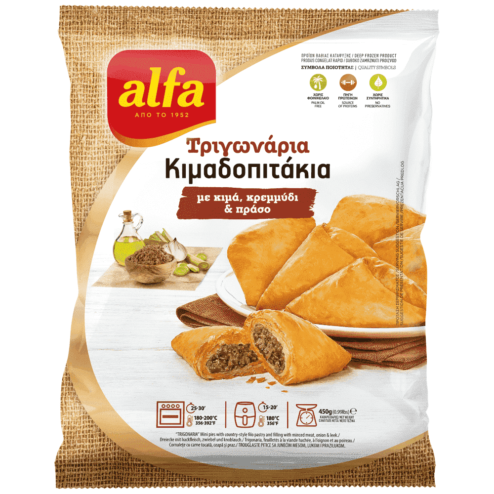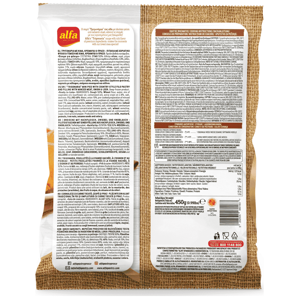 ΖΥΜΗ 52%: Αλεύρι ΣΙΤΟΥ, νερό, μίγμα φυτικών ελαίων (ηλιέλαιο, βαμβακέλαιο), έξτρα παρθένο ελαιόλαδο 2,8%, αλάτι, δεξτρόζη. ΓΕΜΙΣΗ 48%: Νερό, κρεμμύδι 10%, προμαγειρεμένο παρασκεύασμα κρέατος 16%: (βόειος κιμάς 80%, νερό, κρεμμύδι, σογιέλαιο, φυτική ίνα, αλάτι), πράσο 11%, κιμάς ΣΟΓΙΑΣ, ζυμαρικά: (σιμιγδάλι ΣΙΤΟΥ, νερό), τοματοπολτός διπλής συμπύκνωσης, φρυγανιά τρίμμα:[αλεύρι ΣΙΤΟΥ (ανθρακικό ασβέστιο, σίδηρος, νιασίνη, θειαμίνη), αλάτι, αυξητικός παράγοντας: διττανθρακικό αμμώνιο], αλάτι, σιμιγδάλι ΣΙΤΟΥ, παστεριωμένο ασπράδι ΑΥΓΟΥ, μαϊντανός, μίγμα φυτικών ελαίων (ηλιέλαιο, βαμβακέλαιο), ζάχαρη, μαύρο πιπέρι.Αλλεργιογόνα