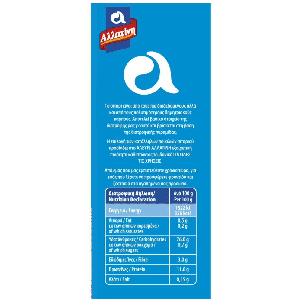 "Το σιτάρι είναι από τους πιο διαδεδομένους αλλά και από τους πιο πολυτιμότερους δημητριακούς καρπούς. Αποτελεί βασικό στοιχείο της διατροφής μας και βρίσκεται στη βάση της διατροφικής πυραμίδας. Η επιλογή των κατάλληλων ποικιλιών σιταριού προσδίδει στο Αλεύρι Αλλατίνη εξαιρετική ποιότητα καθιστώντας το ιδανικό για όλες τις χρήσεις. Από εμάς που μας εμπιστεύεστε χρόνια τώρα, για εσάς που ξέρετε να προσφέρετε φροντίδα και ζεστασιά στα αγαπημένα σας πρόσωπα."