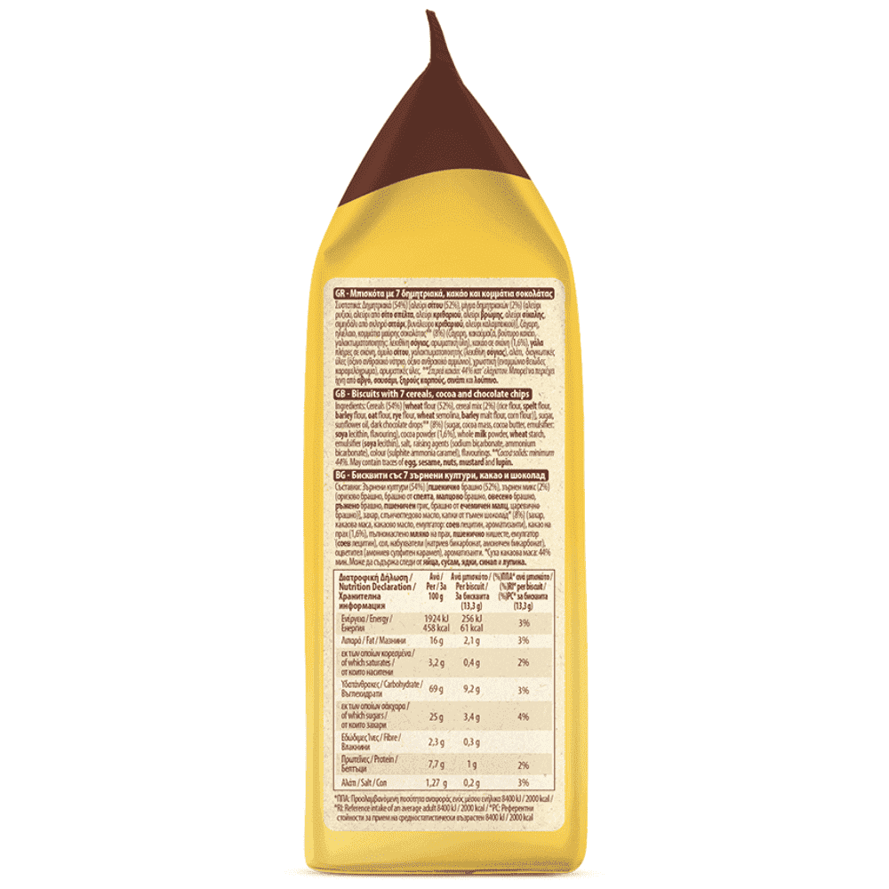 Δημητριακά (54%) [αλεύρι σίτου (52%), μίγμα δημητριακών (2%) (αλεύρι ρυζιού, αλεύρι από σίτο σπέλτα, αλεύρι κριθαριού, αλεύρι βρώμης, αλεύρι σίκαλης, σιμιγδάλι από σκληρό σιτάρι, βυνάλευρο κριθαριού, αλεύρι καλαμποκιού)], ζάχαρη, ηλιέλαιο, κομμάτια μαύρης σοκολάτας** (8%) (ζάχαρη, κακαόμαζα, βούτυρο κακάο, γαλακτωματοποιητής: λεκιθίνη σόγιας, αρωματική ύλη), κακάο σε σκόνη (1,6%), γάλα πλήρες σε σκόνη, άμυλο σίτου, γαλακτωματοποιητής (λεκιθίνη σόγιας), αλάτι, διογκωτικές ύλες (όξινο ανθρακικό νάτριο, όξινο ανθρακικό αμμώνιο), χρωστική (εναμμώνιο θειώδες καραμελόχρωμα), αρωματικές ύλες.
