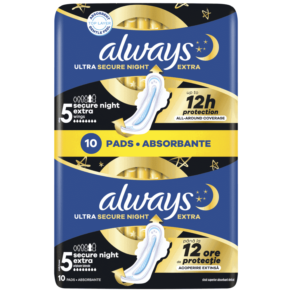 Οι Always Ultra Secure Night (Μέγεθος 4) είναι ειδικά σχεδιασμένες για επιπλέον προστασία κατά τη διάρκεια της νύχτας, αφού διαθέτουν 60% μεγαλύτερο πίσω μέρος (σε σχέση με τις σερβιέτες Always Ultra Normal). Προσφέρουν ακόμη μεγαλύτερη προστασία ενάντια στις διαρροές κατά τη διάρκεια της νύχτας, όσο κι αν κινείστε στον ύπνο σας. Οι σερβιέτες Always Ultra διαθέτουν σύστημα Flex&Fit, που κρατά τη σερβιέτα στη θέση της, και τζελ, που εγκλωβίζει τα υγρά (δεν επιτρέπει διαρροές) και τα συγκρατεί στο κέντρο της σερβιέτας, βοηθώντας στην αποφυγή των διαρροών. Επίσης, διαθέτει τεχνολογία εξουδετέρωσης οσμών, που δεν καλύπτει απλά, αλλά εξουδετερώνει τις οσμές. Οι σερβιέτες Always Ultra Secure Night έχουν πάχος μόλις 3 mm, αλλά προσφέρουν έως και 100% προστασία τη νύχτα για υπέροχη αίσθηση άνεσης. Οι Always Ultra Secure Night (Μέγεθος 4) είναι οι καλύτερες σερβιέτες της Always Ultra για προστασία κατά τη διάρκεια της νύχτας. Αλλάξτε τους κανόνες με τις Always MyFit και νιώστε ασφάλεια όσο κι αν κινείστε στον ύπνο σας.