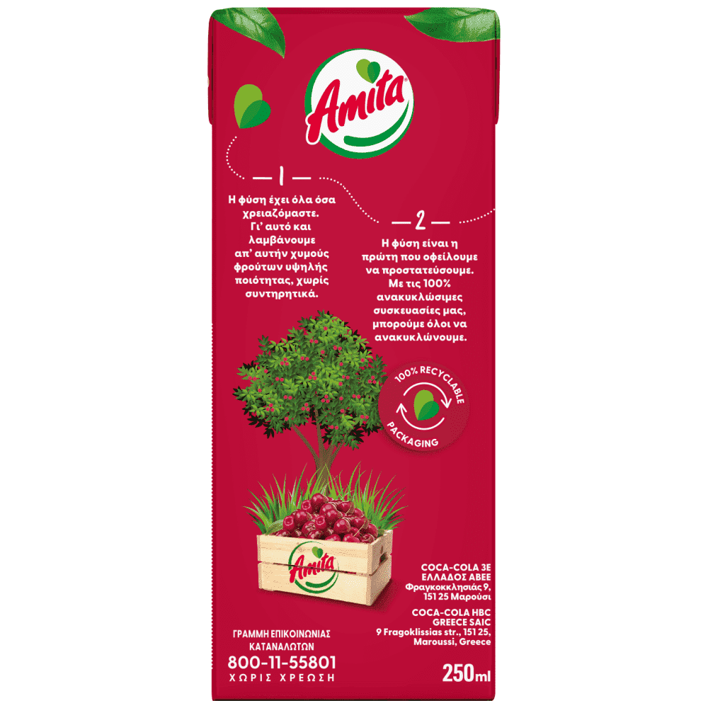 Εμείς στην Amita παρασκευάζουμε και συσκευάζουμε τους χυμούς μας με τις πιο σύγχρονες μεθόδους για να έχετε στο ποτήρι σας τον καλύτερο συσκευασμένο χυμό. Χρησιμοποιούμε εξαιρετικές ποικιλίες φρούτων, εξασφαλίζοντας έτσι τις υψηλότερες προδιαγραφές ποιότητας και ασφάλειας με χυμούς που έχουν υπέροχη γεύση. Οι χυμοί Amita δεν περιέχουν συντηρητικά και πριν τους ανοίξετε μπορείτε να τους αφήνετε εκτός ψυγείου χωρίς τον κίνδυνο αλλοιώσεων, χάρη στην παστερίωση τους και στην ασηπτική συσκευασία TETRA PAK. Πλέον κυκλοφορούν και με μη αποσπώμενο καπάκι συμβάλλοντας στον περιορισμό των απορριμμάτων με την ανακύκλωση ολόκληρης της συσκευασίας.