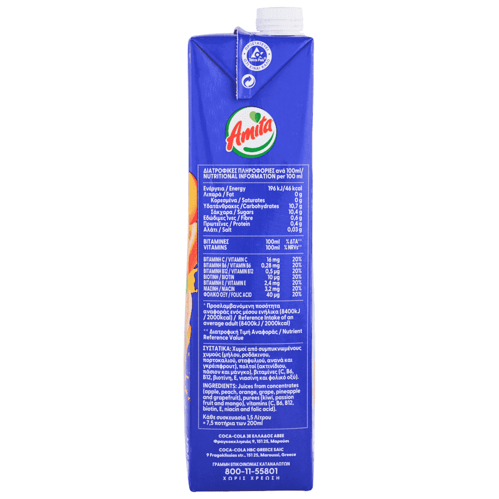Η Amita Motion, είναι ο πρώτος 100% φυσικός χυμός με 9 φρούτα και 7 βιταμίνες, που έχει ξεχωρίσει στην ελληνική αγορά. Έχει καταφέρει να γίνει ο αγαπημένος χυμός των νέων και όχι μόνο, με την άρρηκτη ταύτισή του τόσο με τη φυσική ενέργεια και τη διατροφική αξία όσο και με την έκφραση της Θετικής Ενέργειας που ο καθένας κρύβει μέσα του και μοιράζεται με τους γύρω του. Ένα ποτήρι Amita Motion 200ml καλύπτει το 40% της Συνιστώμενης Ημερήσιας Παροχής στις βιταμίνες, που περιέχει ο χυμός (Βιταμίνη C, βιταμίνη B6, Βιταμίνη Β12, Βιοτίνη, Βιταμίνη Ε, Νιασίνη, Φoλικό οξύ). Πλέον κυκλοφορεί και με μη αποσπώμενο καπάκι συμβάλλοντας στον περιορισμό των απορριμμάτων με την ανακύκλωση ολόκληρης της συσκευασίας.