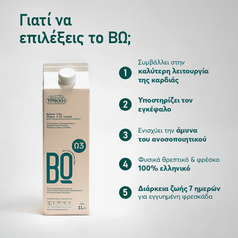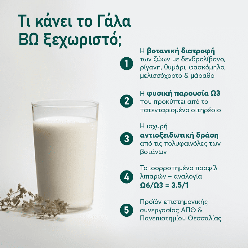 Το καινοτόμο, φρέσκο, βιολειτουργικό γάλα ΒΩ παράγεται σε πιστοποιημένες Θεσσαλικές φάρμες και ξεχωρίζει χάρη στο πατενταρισμένο βοτανικό σιτηρέσιο των ζώων. Η ειδική αυτή διατροφή ενισχύει το προφίλ Ω3 και τη θρεπτική του αξία. Αποκλειστικά σε επιλεγμένα καταστήματα My market