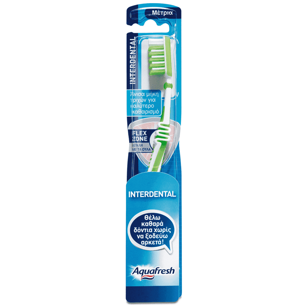 Η οδοντόβουρτσα Aquafresh Interdental, με μέτριες τρίχες, έχει άνισα μήκη τριχών για καλύτερο καθαρισμό. Οι κοντές τρίχες καθαρίζουν την επιφάνεια των δοντιών, ενώ οι μακρύτερες καθαρίζουν ανάμεσα στα δόντια. Η μοναδική ευλύγιστη κεφαλή, χάρη στο Flex Zone, λυγίζει για να απορροφά την επιπλέον πίεση από το βούρτσισμα προσφέροντας ολοκληρωμένο καθαρισμό, ενώ είναι απαλή με τα ούλα.