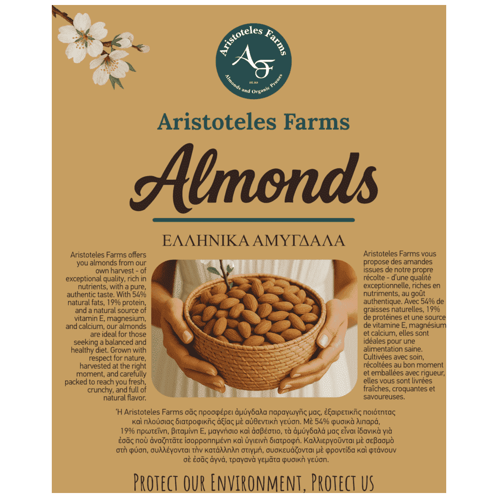 Η Aristoteles Farms σας προσφέρει αμύγδαλα παραγωγής μας, εξαιρετικής ποιότητας και πλούσιας διατροφικής αξίας με αυθεντική γεύση. Με 54% φυσικά λιπαρά, 19% πρωτεΐνη, βιταμίνη E, μαγνήσιο και ασβέστιο, τα αμύγδαλά μας είναι ιδανικά για εσάς που αναζητάτε ισορροπημένη και υγιεινή διατροφή. Καλλιεργούνται με σεβασμό στη φύση, συλλέγονται την κατάλληλη στιγμή, συσκευάζονται με φροντίδα και φτάνουν σε εσάς αγνά, τραγανά γεμάτα φυσική γεύση.