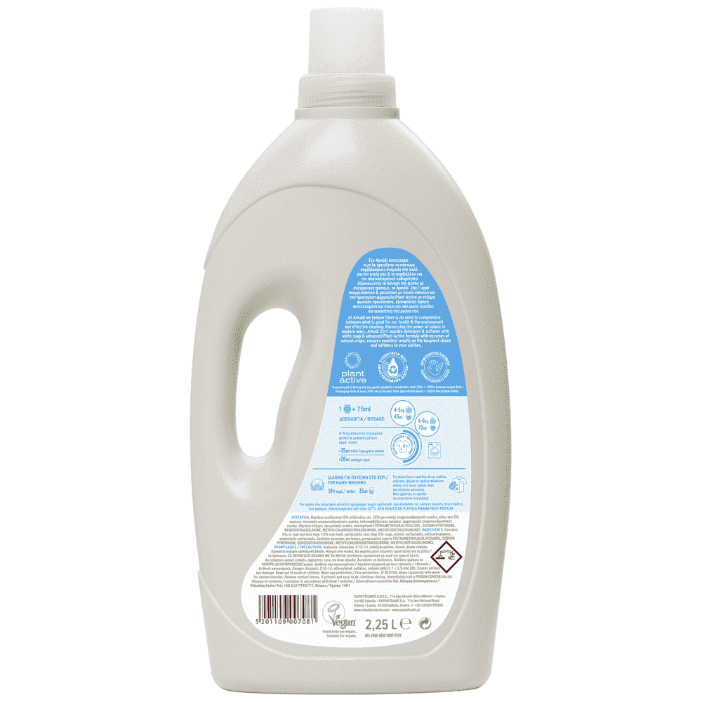 "Στο Αρκάδι πιστεύουμε πως δε χρειάζεται να κάνουμε συμβιβασμούς ανάμεσα στο καλό για την υγεία μας & το περιβάλλον και την αποτελεσματική καθαριότητα. Αξιοποιώντας τη δύναμη της φύσης με σύγχρονους τρόπους, το Αρκάδι 2σε1 υγρό απορρυπαντικό & μαλακτικό με λευκό σαπούνι και την προηγμένη φόρμουλα Plant Active με ένζυμα φυσικής προέλευσης, εξασφαλίζει άψογα αποτελέσματα και στους πιο σκληρούς λεκέδες και απαλότητα στα ρούχα σας.
