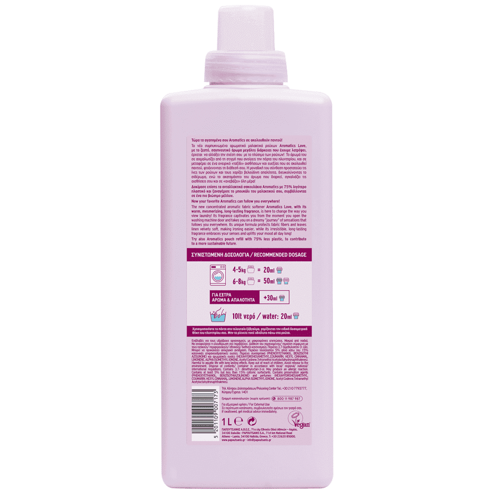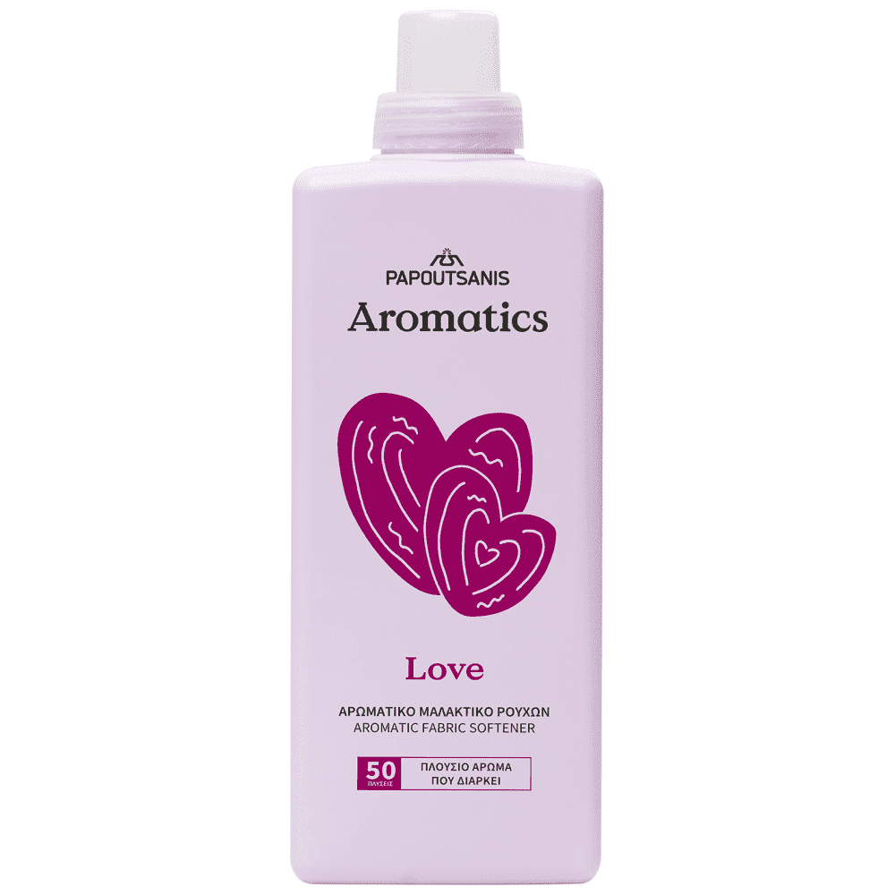 Το νέο συμπυκνωμένο αρωματικό μαλακτικό ρούχων Aromatics Love, με τo ζεστό, σαγηνευτικό άρωμα μεγάλης διάρκειας που έχουμε λατρέψει, έρχεται να αλλάξει την σχέση σου με το πλύσιμο των ρούχων! Το άρωμά του σε αιχμαλωτίζει από τη στιγμή που ανοίγεις την πόρτα του πλυντηρίου και σε μεταφέρει σε ένα ονειρικό «ταξίδι» αισθήσεων και ευεξίας που σε ακολουθεί παντού, φτιάχνοντας τη διάθεσή σου. Η μοναδική του σύνθεση προστατεύει τις ίνες των ρούχων και τους χαρίζει βελούδινη απαλότητα, διευκολύνοντας το σιδέρωμα, ενώ το ακαταμάχητο του άρωμα που διαρκεί, αγκαλιάζει τις αισθήσεις σου και σε «ανεβάζει» όλη μέρα!