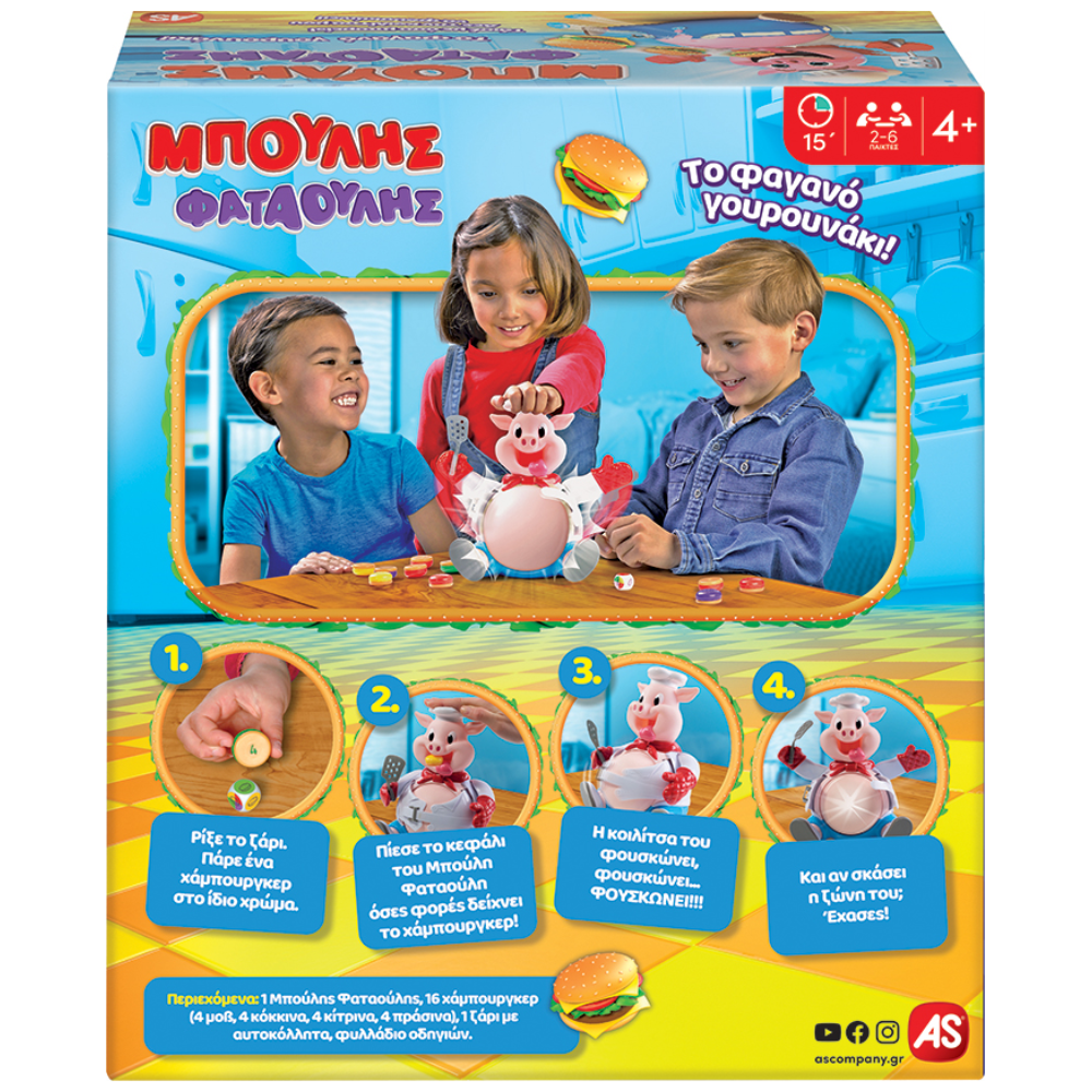 Αναγνώριση αριθμών και χρωμάτων: Τα χάμπουργκερ έχουν 4 διαφορετικά χρώματα. Οι παίκτες ρίχνουν το ζάρι και επιλέγουν ένα χάμπουργκερ με το αντίστοιχο χρώμα. Στη συνέχεια, ελέγχουν το κάτω μέρος του χάμπουργκερ, το οποίο έχει έναν αριθμό από το 1 έως το 4. Διασκεδαστικό και εύκολο παιχνίδι: Κάθε παίκτης με τη σειρά ταΐζει τον Μπούλη Φαταούλη με το χάμπουργκερ που υποδεικνύει το ζάρι. Στη συνέχεια, πατάει προς τα κάτω το κεφάλι του όσες φορές αναγράφεται στο χάμπουργκερ. Προκαλεί στα παιδιά αγωνία και ενθουσιασμό: Κάθε φορά που το παιδί πιέζει το κεφάλι του Μπούλη Φαταούλη, η κοιλιά του μεγαλώνει. όπως και ο ενθουσιασμός! Η κοιλίτσα του μεγαλώνει, μεγαλώνει και ΜΕΓΑΛΩΝΕΙ μέχρι να σκάσει! Αριθμός Παικτών: 2-6 Καταλληλότητα Ηλικίας: 4+ Χρονών Μέση Διάρκεια Παιχνιδιού: 15 λεπτά