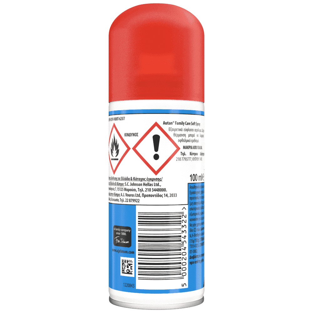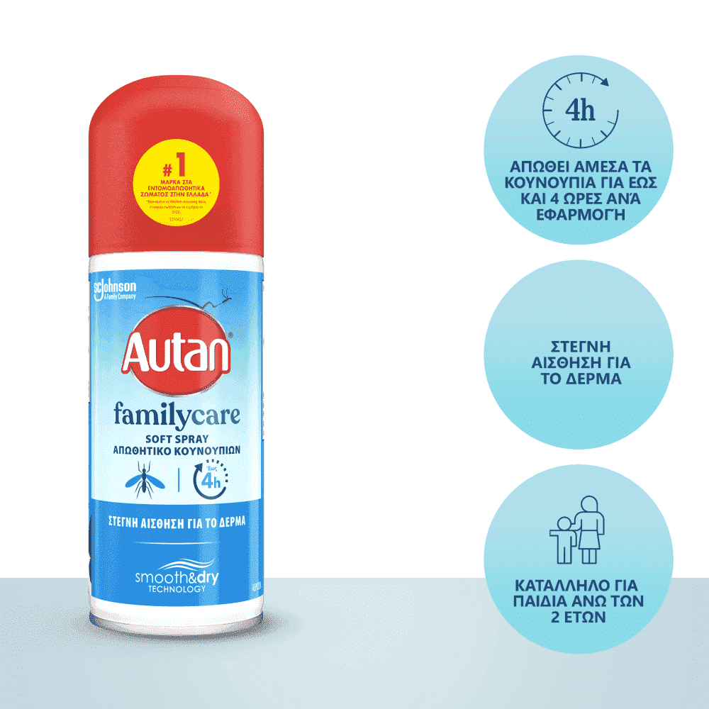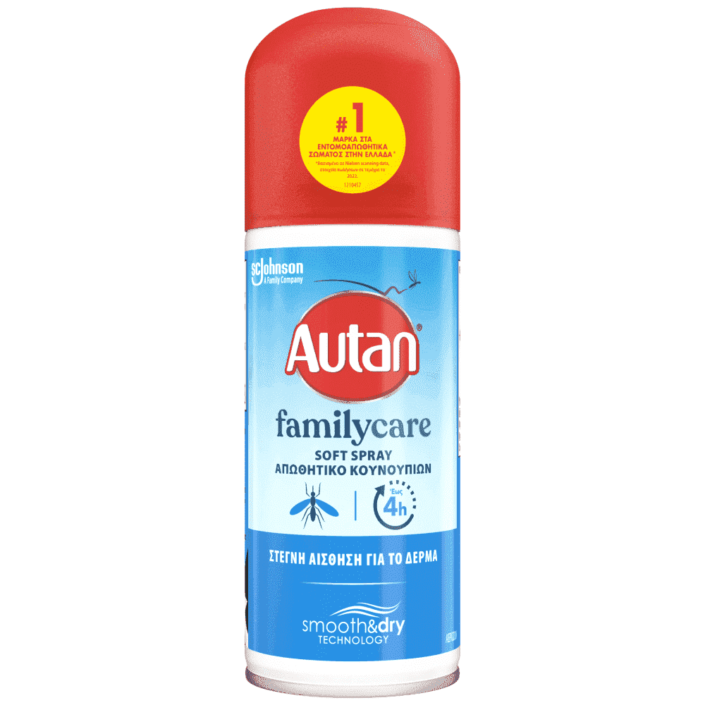 To Autan Family Care Soft Spray απωθεί άμεσα τα κουνούπια ενώ αφήνει μια απαλή και στεγνή αίσθηση στο δέρμα. Μπορεί να χρησιμοποιηθεί σε παιδιά άνω των 2 ετών.
