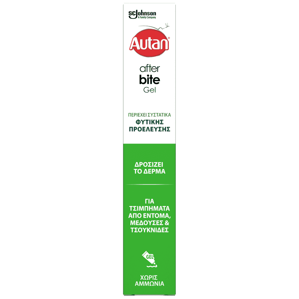 To Autan After bite Gel είναι φτιαγμένο με πάνω από 95% συστατικά φυτικής προέλευσης και νερό. Δροσίζει άμεσα το δέρμα μετά το τσίμπημα ενός εντόμου όπως κουνουπιού ή αλογόμυγας καθώς και μετά από επαφή με κάμπια, τσουκνίδα, κεντρί σφήκας ή μέδουσα. Η πρακτική συσκευασία του προσφέρει ευκολία στην εφαρμογή, χωρίς να χρειάζεται επάλλειψη με το χέρι.