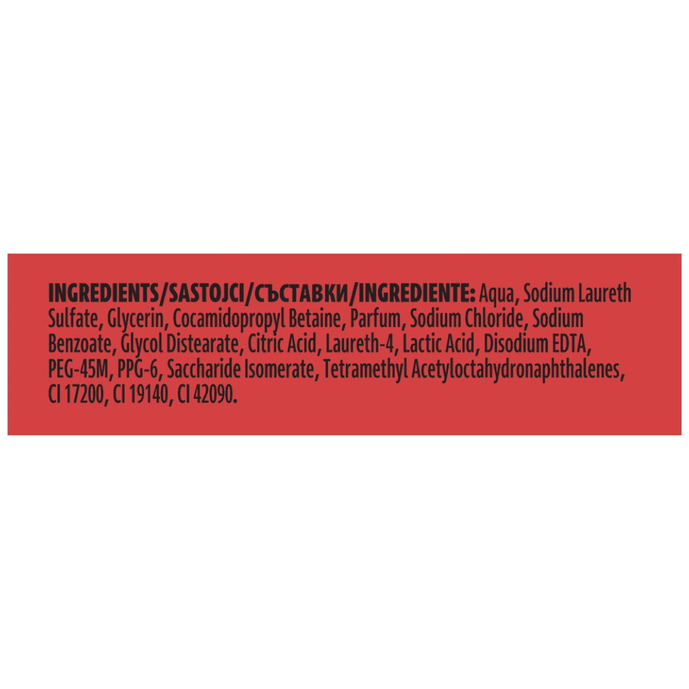 Aqua, Sodium Laureth Sulfate, Glycerin, Cocamidopropyl Betaine, Parfum, Sodium Chloride, Sodium Benzoate, Glycol Distearate, Citric Acid, Laureth-4, Lactic Acid, Disodium EDTA, PEG-45M, PPG-6, Saccharide Isomerate, Tetramethyl Acetyloctahydronaphthalenes, CI 17200, CI 19140, CI 42090.