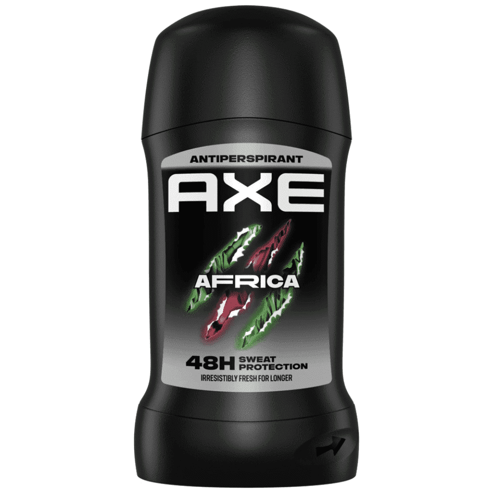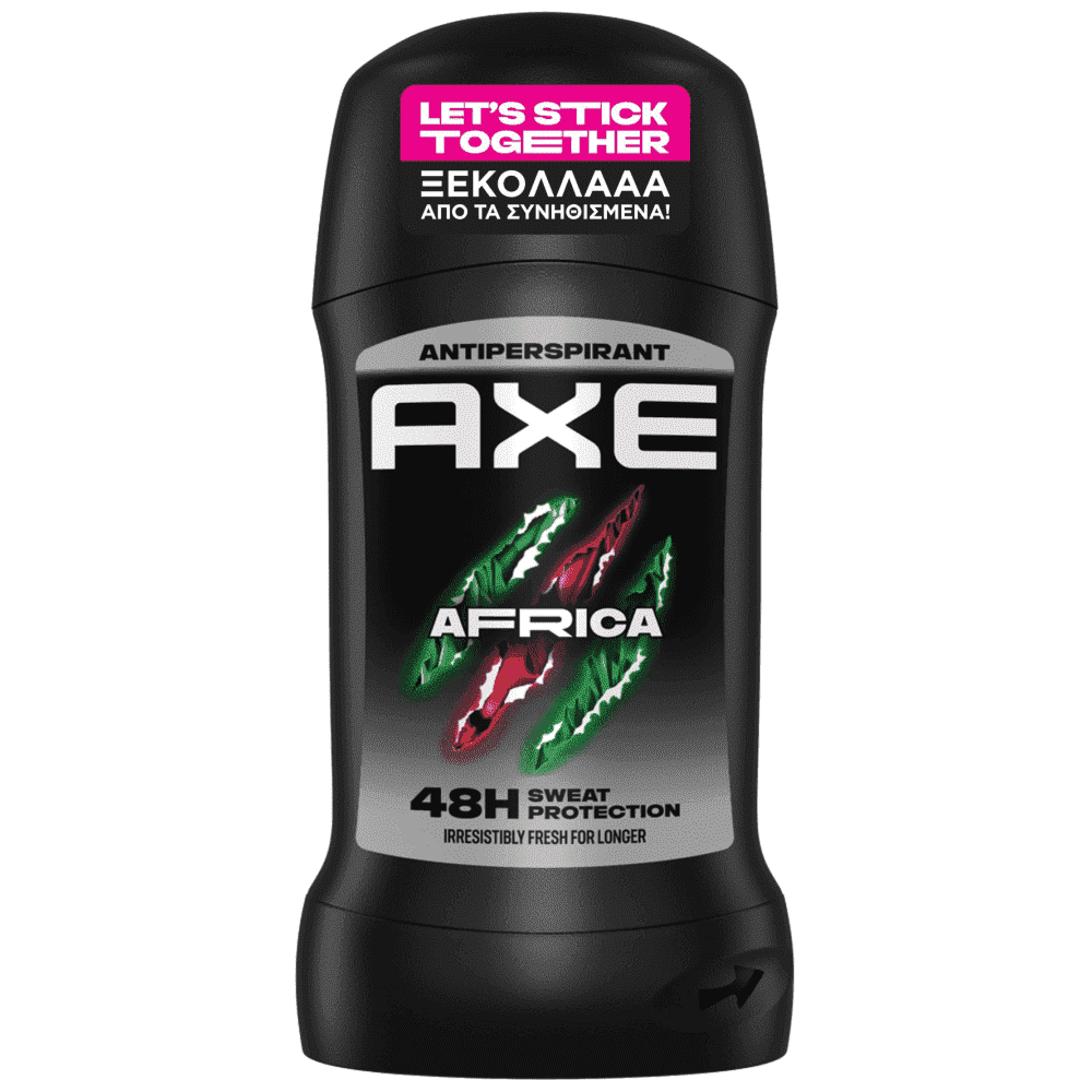 Το αποσμητικό AXE AFRICA STICK με αντιιδρωτική τεχνολογία προσφέρει έως και 48 ώρες φρεσκάδας. Εξωτικό άρωμα με νότες εσπεριδοειδών και κεχριμπαριού. Το άρωμα AXE Africa φέρνει την περιπέτεια ακόμα και στο γκρι της καθημερινότητας με το ασυνήθιστο άρωμα εσπεριδοειδών και κεχριμπαριού. Αποτρέπει αποτελεσματικά την εφίδρωση και η αξεπέρασστη μυρωδιά του θα σας κάνει ακαταμάχητους. Αυτό το αποσμητικό AXE STICK είναι εύκολο στην εφαρμογή, διαρκεί εως και 48 ώρες. Σας προτείνουμε να το συνδυάσετε με αφρόλουτρο AXE Africa 400ml.