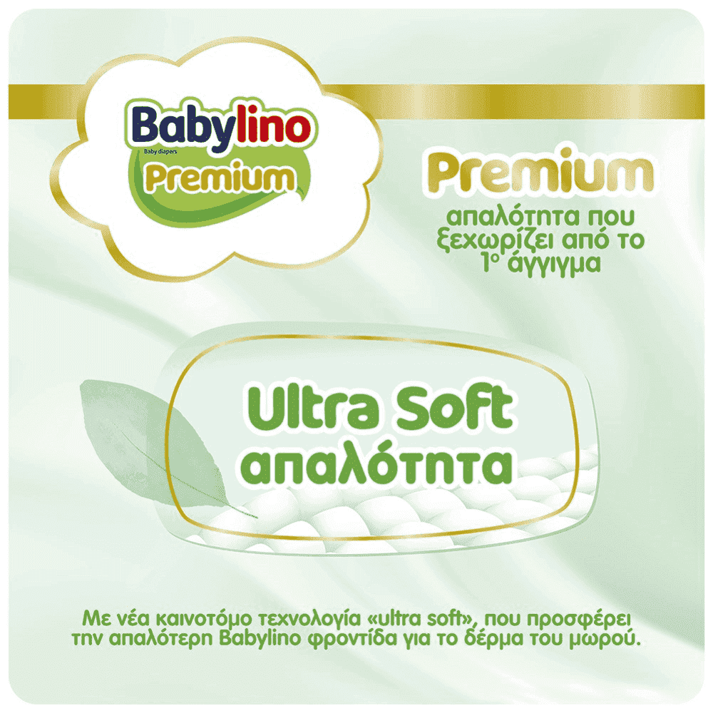 Οι ΝΕΕΣ βρεφικές πάνες Babylino Premium, διαθέτουν τη νέα καινοτόμο τεχνολογία «ultra soft», που προσφέρει την απαλότερη Babylino φροντίδα για το δέρμα του μωρού. Με εξαιρετικά απαλά υλικά, πιστοποιημένα ασφαλή, που αγγίζουν την ευαίσθητη βρεφική επιδερμίδα σαν βελούδινο χάδι. Premium απορροφητικότητα Ελεγμένες για νυχτερινή χρήση Night use tested, είναι ειδικά σχεδιασμένες να προσφέρουν extra απορροφητικότητα, προστασία από διαρροές και δυσάρεστες οσμές και τη στεγνότητα που χρειάζεται το δερματάκι του μωρού, ακόμα και μετά από πολύωρη χρήση τη νύχτα. Με δείκτη υγρασίας. Premium εφαρμογή Πολύ λεπτές και σταθερές, με ειδικά ελαστικά, που ακολουθούν κάθε κίνηση του μωρού. Premium προστασία Με κορυφαίες συστάσεις και πιστοποιήσεις από ειδικούς. -Κλινικά ελεγμένες με άριστα αποτελέσματα, μετά από έλεγχο 4 εβδομάδων σε βρέφη υπό την επίβλεψη δερματολόγων και παιδιάτρων στο Δερματολογικό εργαστήριο Dermatest (Γερμανία). -Συνιστώνται από την Ελληνική Εταιρεία Παιδιατρικής Δερματολογίας. -Συνιστώνται από τον Σύλλογο Επιστημόνων Μαιών και Μαιευτών Αθήνας. -Χωρίς λάτεξ, λοσιόν, παραβένες, ΕU αλλεργιογόνα. -Παράγονται ανέπαφα στην Ελλάδα από την 100% ελληνική εταιρεία ΜΕΓΑ Α.Ε. Σε συσκευασία των 64 τεμαχίων.
