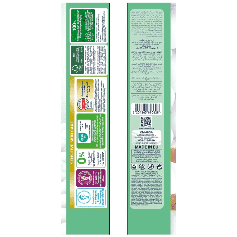 3D προστασία όποια κίνηση κι αν κάνει το μωρό. Premium εφαρμογή Με ανατομικό σχεδιασμό Αll around elastic, περιμετρικά στη μεσούλα και στα ποδαράκια, για τέλεια εφαρμογή. Premium απορροφητικότητα Ελεγμένες για νυχτερινή χρήση Night use tested, χαρίζουν προστασία από διαρροές και δυσάρεστες οσμές και τη στεγνότητα που χρειάζεται το δερματάκι του μωρού, ακόμα και μετά από πολύωρη χρήση τη νύχτα και με δείκτη υγρασίας σε όλα τα μεγέθη. Παράλληλα, διαθέτουν τη νέα καινοτόμο τεχνολογία «ultra soft», που προσφέρει την απαλότερη Babylino φροντίδα για το δέρμα του μωρού. Με εξαιρετικά απαλά υλικά, πιστοποιημένα ασφαλή, που αγγίζουν την ευαίσθητη βρεφική επιδερμίδα σαν βελούδινο χάδι. Premium προστασία Με κορυφαίες συστάσεις και πιστοποιήσεις από ειδικούς. -Κλινικά ελεγμένες με άριστα αποτελέσματα, μετά από έλεγχο 4 εβδομάδων σε βρέφη υπό την επίβλεψη δερματολόγων και παιδιάτρων στο Δερματολογικό εργαστήριο Dermatest (Γερμανία). -Συνιστώνται από την Ελληνική Εταιρεία Παιδιατρικής Δερματολογίας. -Συνιστώνται από τον Σύλλογο Επιστημόνων Μαιών και Μαιευτών Αθήνας. -Χωρίς λάτεξ, λοσιόν, παραβένες, ΕU αλλεργιογόνα. -Παράγονται ανέπαφα στην Ελλάδα από την 100% ελληνική εταιρεία ΜΕΓΑ Α.Ε.