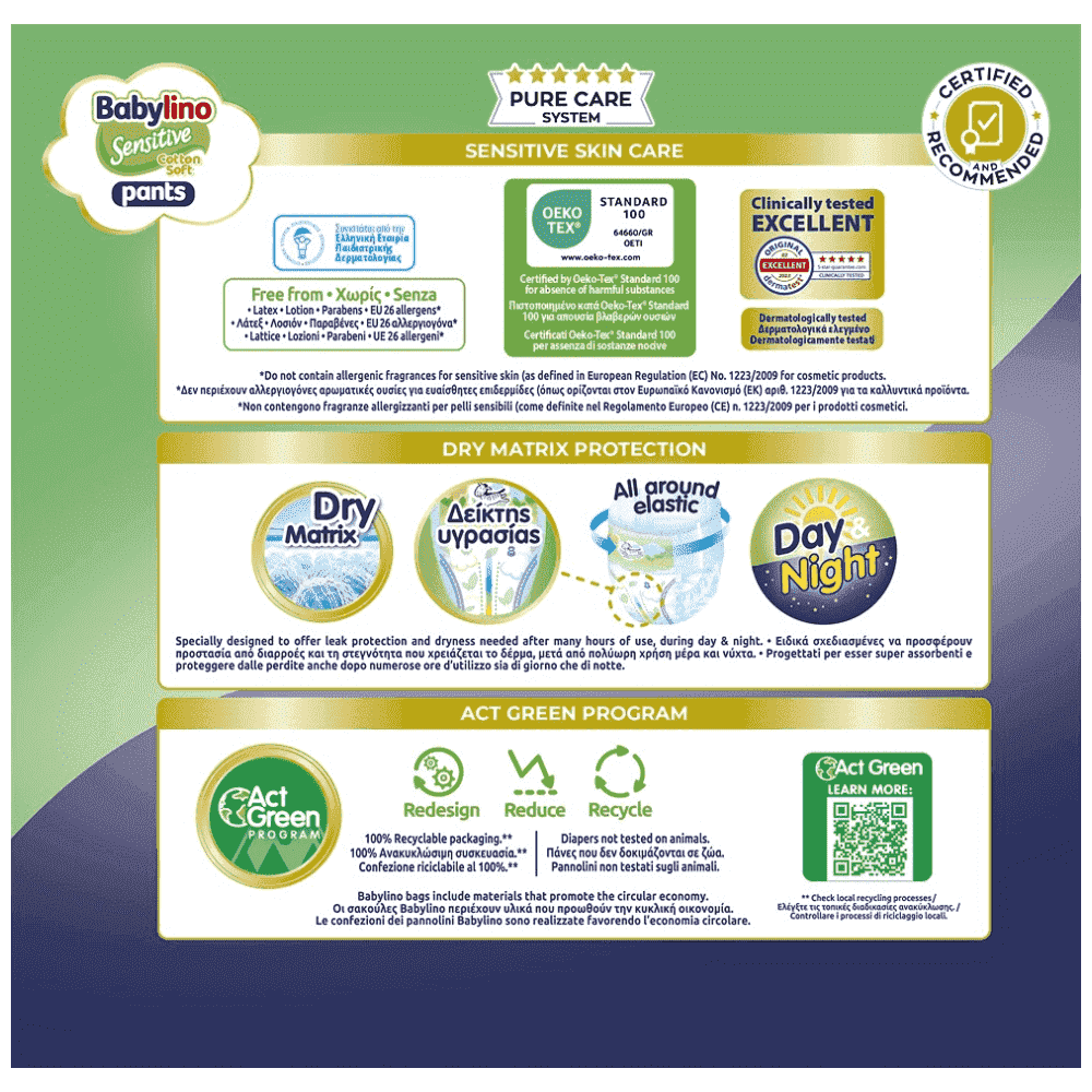 Οι νέες πάνες-βρακάκι Babylino Sensitive Pants Cotton Soft είναι σχεδιασμένες με βάση το Σύστημα Αγνής Φροντίδας Pure Care System, που αποτυπώνει όλο το Σύστημα ελέγχων, πιστοποιήσεων και αυστηρών διαδικασιών διασφάλισης ποιότητας πίσω από την παραγωγή τους. Η τεχνολογία ‘all around elastic’ προσφέρει 360ο ελαστικότητα περιμετρικά στη μεσούλα και στα ποδαράκια, αγκαλιάζει μοναδικά το σωματάκι του μωρού σε κάθε κίνηση και συγκρατεί την πάνα-βρακάκι σταθερή στη θέση της, χωρίς να «κρεμάει». Κατάλληλες για να διευκολύνουν την αλλαγή της πάνας και το στάδιο εκμάθησης της τουαλέτας, αφού ανεβοκατεβαίνουν εύκολα σαν κανονικό εσώρουχο, χωρίς απαραίτητα το μωρό να είναι σταθερό και σε ύπτια θέση.