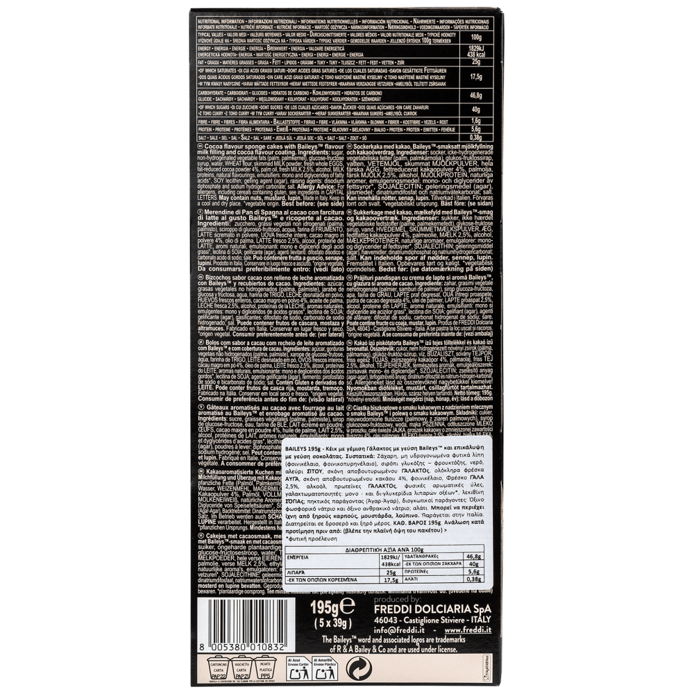 Ζάχαρη, μη υδρογονωμένα φυτικά λιπαρά (φοινικέλαιο, πυρηνέλαιο φοινικιάς), σιρόπι γλυκόζης-φρουκτόζης, νερό, αλεύρι σίτου, αποβουτυρωμένο γάλα σε σκόνη, φρέσκα ολόκληρα αυγά, κακάο με μειωμένα λιπαρά (4%), φοινικέλαιο, φρέσκο γάλα (2,5%), αλκοόλη, πρωτεΐνες γάλακτος, φυσικά αρώματα, γαλακτωματοποιητές: μονο- και διγλυκερίδια λιπαρών οξέων* (φυτικής προέλευσης), λεκιθίνη σόγιας· πηκτικός παράγοντας: άγαρ· διογκωτικά μέσα: δισόξινο φωσφορικό νάτριο, όξινο ανθρακικό νάτριο (διττανθρακικό νάτριο), αλάτι.Αλλεργιογόνα