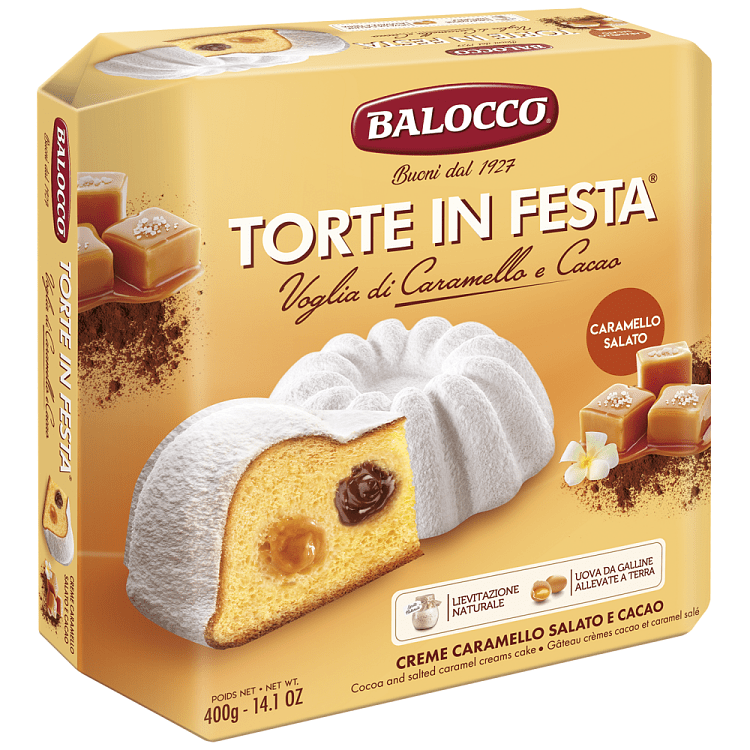 Η Balocco Torte in Festa Voglia di Caramello E Cacao (Κέικ με Αλατισμένη Καραμέλα & Κρέμα Κακάο) είναι μια απολαυστική πρόταση που ενώνει τη βελούδινη κρέμα κακάο με την έντονη και γλυκιά γεύση της αλατισμένης καραμέλας, δημιουργώντας μια απολαυστική ισορροπία γεύσεων και έναν ακαταμάχητο συνδυασμό.