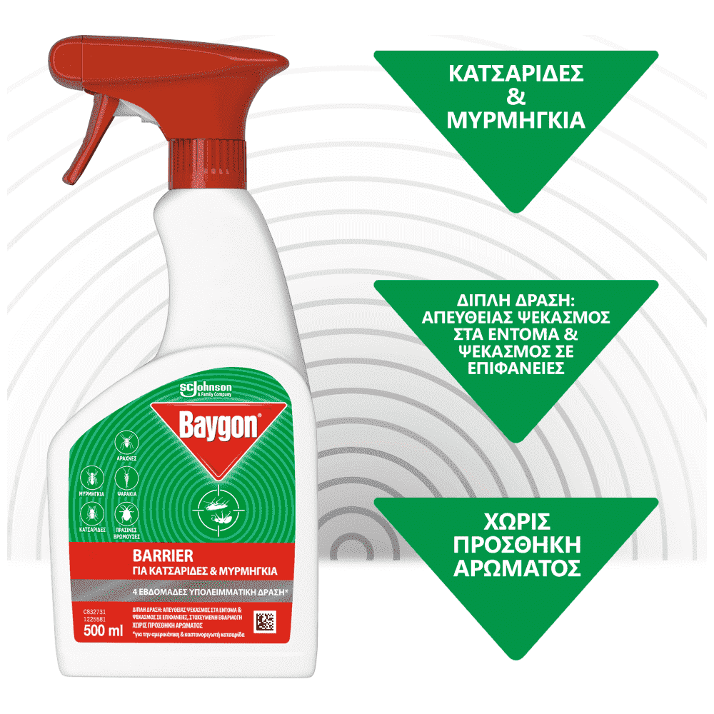 "Για Κατσαρίδες και Μυρμήγκια. 4 εβδομάδες υπολειμματική δράση (για την αμερικάνικη & καστανοριγωτή κατσαρίδα). Διπλή δράση: απευθείας ψεκασμός στα έντομα & ψεκασμός σε επιφάνειες, στοχευμένη εφαρμογή. Χωρίς προσθήκη αρώματος.