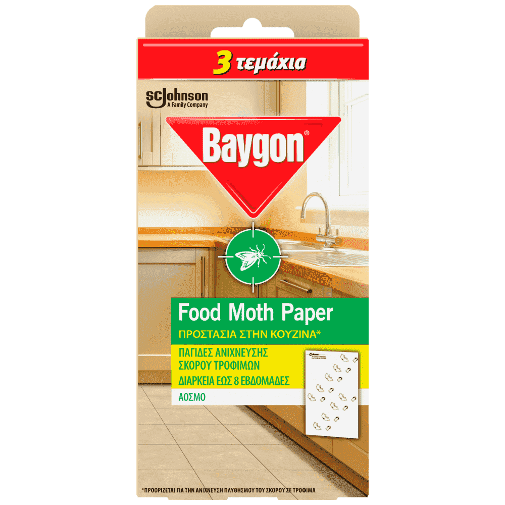 Το Baygon Food Moth Paper περιέχει μία φερομόνη η οποία προσελκύει τους αρσενικούς σκόρους. Οι σκόροι κολλάνε πάνω στη χάρτινη λωρίδα. Έτσι μία ενδεχόμενη παρουσία σκόρων στα τρόφιμα μπορεί να ανιχνευθεί σε πολύ αρχικό στάδιο.