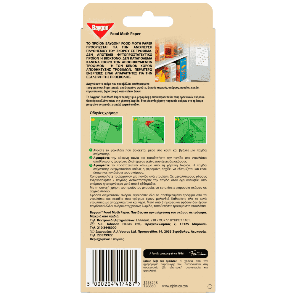 Raid Food Moth Paper. Παγίδες για την ανίχνευση του σκόρου σε τρόφιμα. Προφυλάξεις: Μακριά από παιδιά Τηλ. Κέντρου Δηλητηριάσεων: ΕΛΛΑΔΑΣ 210 7793777 (GR) S.C. Johnson Hellas Ltd., Φραγκοκκλησιάς 7, 15125 Μαρούσι, Τηλ. 210 3448000. (CY) Διανομέας: A.J. Vouros Ltd, Προποντίδος 14, 2033 Στρόβολος, Λευκωσία, Τηλ. 22 879922