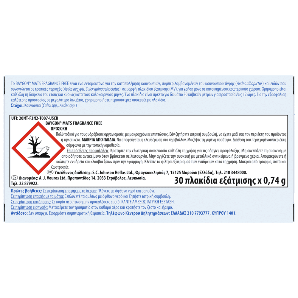 Baygon Mat ΠΡΟΣΟΧΗ Πολύ τοξικό για τους υδρόβιους οργανισμούς, με μακροχρόνιες επιπτώσεις. Εάν ζητήσετε ιατρική συμβουλή, να έχετε μαζί σας τον περιέκτη του προϊόντος ή την ετικέτα.ΜΑΚΡΙΑ ΑΠΟ ΠΑΙΔΙΑ. Να αποφεύγεται η ελευθέρωση στο περιβάλλον. Μαζέψτε τη χυμένη ποσότητα. Διάθεση του περιεχομένου/περιέκτη σύμφωνα με την τοπική νομοθεσία. Επιπρόσθετες προφυλάξεις: Κρατήστε την εξωτερική συσκευασία καθ' όλη τη χρήση για τις οδηγίες προφύλαξης. Μη σκεπάζετε τη συσκευή με οποιοδήποτε αντικείμενο όταν βρίσκεται σε λειτουργία. Μην αγγίζετε την συσκευή με μεταλλικά αντικείμενα ή βρεγμένα χέρια. Απομακρύνετε ή καλύψτε ενυδρεία και κλουβιά ζώων πριν την εφαρμογή. Κλείστε τα φίλτρα εξαερισμού των ενυδρείων κατά τη χρήση. Μακριά από τρόφιμα, ποτά και ζωοτροφές. Υπεύθυνος διάθεσης: S.C. Johnson Hellas Ltd., Φραγκοκκλησιάς 7, 15125Μαρούσι (Ελλάδα), Τηλ. 210 3448000. GΔιανομέας: A. J. Vouros Ltd, Προποντίδος 14, 2033 Στρόβολος, Λευκωσία, Τηλ. 22 879922.