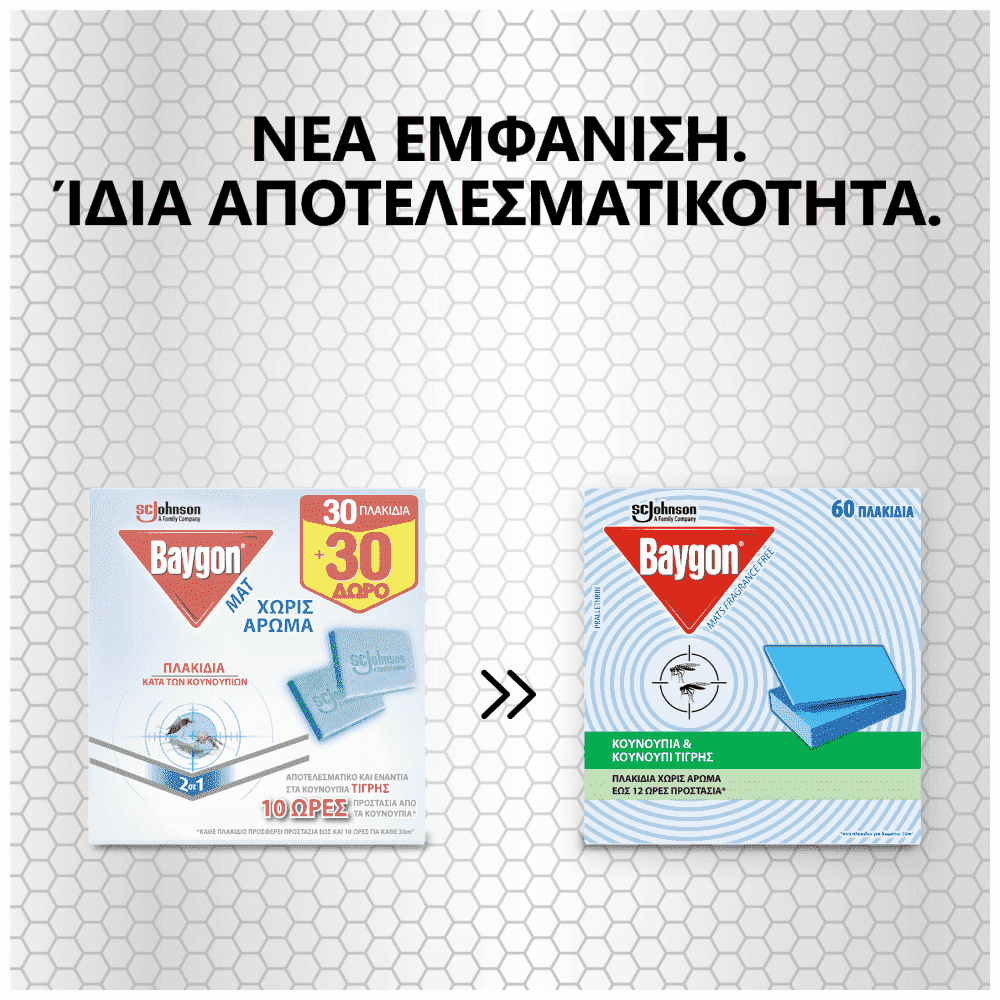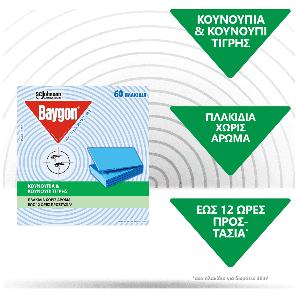 "Το BAYGON MATS FRAGRANCE FREE είναι ένα εντομοκτόνο για την καταπολέμηση κουνουπιών, συμπεριλαμβανομένων του κουνουπιού τίγρης (Aedes albopictus) και ειδών που συναντώνται σε τροπικές περιοχές (Aedes aegypti, Culexquinquefasciatus), σε μορφή πλακιδίου εξάτμισης (MV), για χρήση μόνο σε κατοικημένους εσωτερικούς χώρους. Χρησιμοποιείται καθ’ όλη τη διάρκεια του έτους και κυρίως κατά τους καλοκαιρινούς μήνες. Ένα πλακίδιο είναι αρκετό για δωμάτιο 30 κυβικών μέτρων για προστασία έως 12 ώρες. Για την εξασφάλιση καλύτερης προστασίας σε μεγαλύτερα δωμάτια, χρησιμοποιήστε περισσότερες συσκευές με πλακίδια.