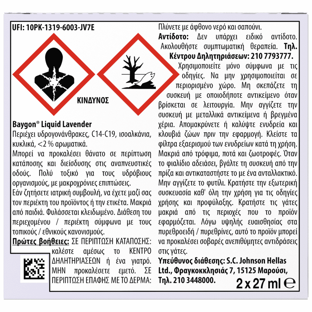 Περιέχει υδρογονάνθρακες, C14- C19, ισοαλκάνια, κυκλικά, <2% αρωματικά. Μπορεί να προκαλέσει θάνατο σε περίπτωση κατάποσης και διείσδυσης στις αναπνευστικές οδούς. Πολύ τοξικό για τους υδρόβιους οργανισμούς, με μακροχρόνιες επιπτώσεις. Εάν ζητήσετε ιατρική συμβουλή, να έχετε μαζί σας τον περιέκτη του προϊόντος ή την ετικέτα. Μακριά από παιδιά. Φυλάσσεται κλειδωμένο. Διάθεση του περιεχομένου / περιέκτη σύμφωνα με τους τοπικούς / εθνικούς κανονισμούς. Πρώτες Βοήθειες: ΣΕ ΠΕΡΙΠΤΩΣΗ ΚΑΤΑΠΟΣΗΣ: Καλέστε αμέσως το ΚΕΝΤΡΟ ΔΗΛΗΤΗΡΙΑΣΕΩΝ ή ένα γιατρό. ΜΗΝ προκαλέσετε εμετό. ΣΕ ΠΕΡΙΠΤΩΣΗ ΕΠΑΦΗΣ ΜΕ ΤΟ ΔΕΡΜΑ: Πλύνετε με άφθονο νερό και σαπούνι. Χρησιμοποιείτε μόνο σύμφωνα με τις οδηγίες. Να μην χρησιμοποιείται σε περιορισμένο χώρο. Κρατήστε την εξωτερική συσκευασία καθ' όλη την χρήση για τις οδηγίες χρήσης και προφύλαξης. Μη σκεπάζετε τη συσκευή με οποιοδήποτε αντικείμενο όταν βρίσκεται σε λειτουργία. Μην αγγίζετε την συσκευή με μεταλλικά αντικείμενα ή βρεγμένα χέρια. Απομακρύνετε ή καλύψτε ενυδρεία και κλουβιά ζώων πριν την εφαρμογή. Κλείστε τα φίλτρα εξαερισμού των ενυδρείων κατά τη χρήση. Όταν το φιαλίδιο αδειάσει, βγάλτε τη συσκευή από την πρίζα και αντικαταστήστε το με ένα ανταλλακτικό. Μην αγγίζετε το φυτίλι.Μακριά από τρόφιμα, ποτά και ζωοτροφές. Κρατήστε τις γάτες μακριά από τις περιοχές που το προϊόν εφαρμόζεται. Λόγω υψηλής ευαισθησίας στα πυρεθροειδή / πυρεθρίνες, αυτό το προϊόν μπορει να προκαλέσει σοβαρές ανεπιθύμητες αντιδράσεις στις γάτες. Αντίδοτο: Δεν υπάρχει ειδικό αντίδοτο. Ακολουθήστε συμπτωματική θεραπεία. Τηλ. Κέντρου Δηλητηριάσεων: ΕΛΛΑΔΑΣ 210-7793777, ΚΥΠΡΟΥ 1401. Υπεύθυνος για τελική συσκευασία και σήμανση: S.C. Johnson Hellas Ltd., Φραγκοκκλησιάς 7, 15125Μαρούσι, Τηλ. 210 3448000. Διανομέας: A.J. Vouros Ltd, Προποντίδος 14, 2033 Στρόβολος, Λευκωσία, Τηλ. 22 879922."