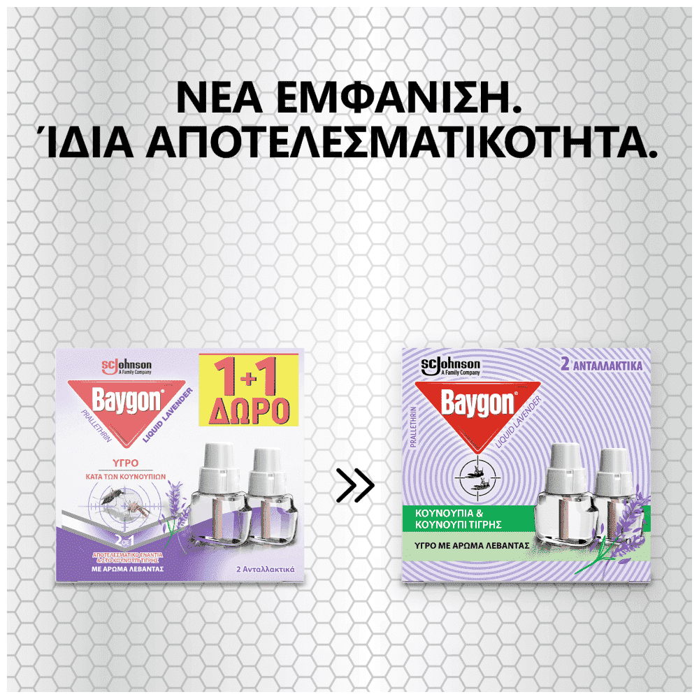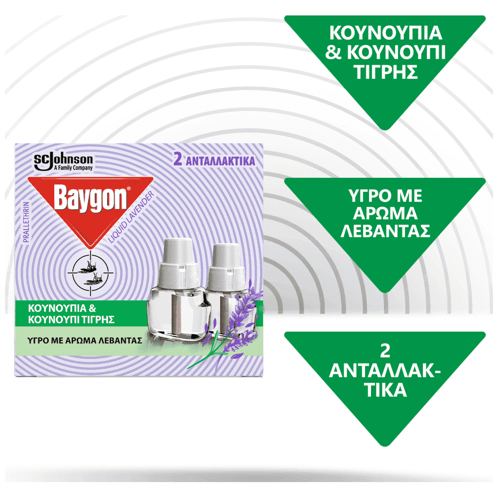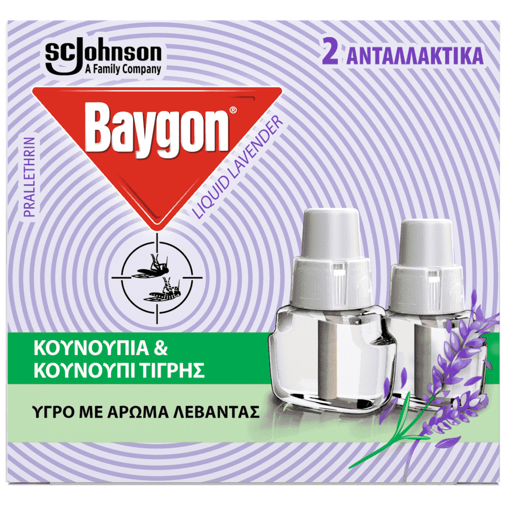 To Baygon Liquid προσφέρει προστασία από τα κουνούπια (και το Ασιατικό κουνούπι τίγρης) σε εσωτερικούς χώρους. Η σύνθεσή του περιέχει άρωμα λεβάντας. Ένα φιαλίδιο 27ml Baygon Liquid Lavender είναι αρκετό για χώρο 30κ.μ. και η δράση του διαρκεί για έως 45 νύχτες όταν χρησιμοποιείται 8 ώρες τη νύχτα με την απλή ή με τη ρυθμιζόμενη συσκευή στη χαμηλή ένταση.