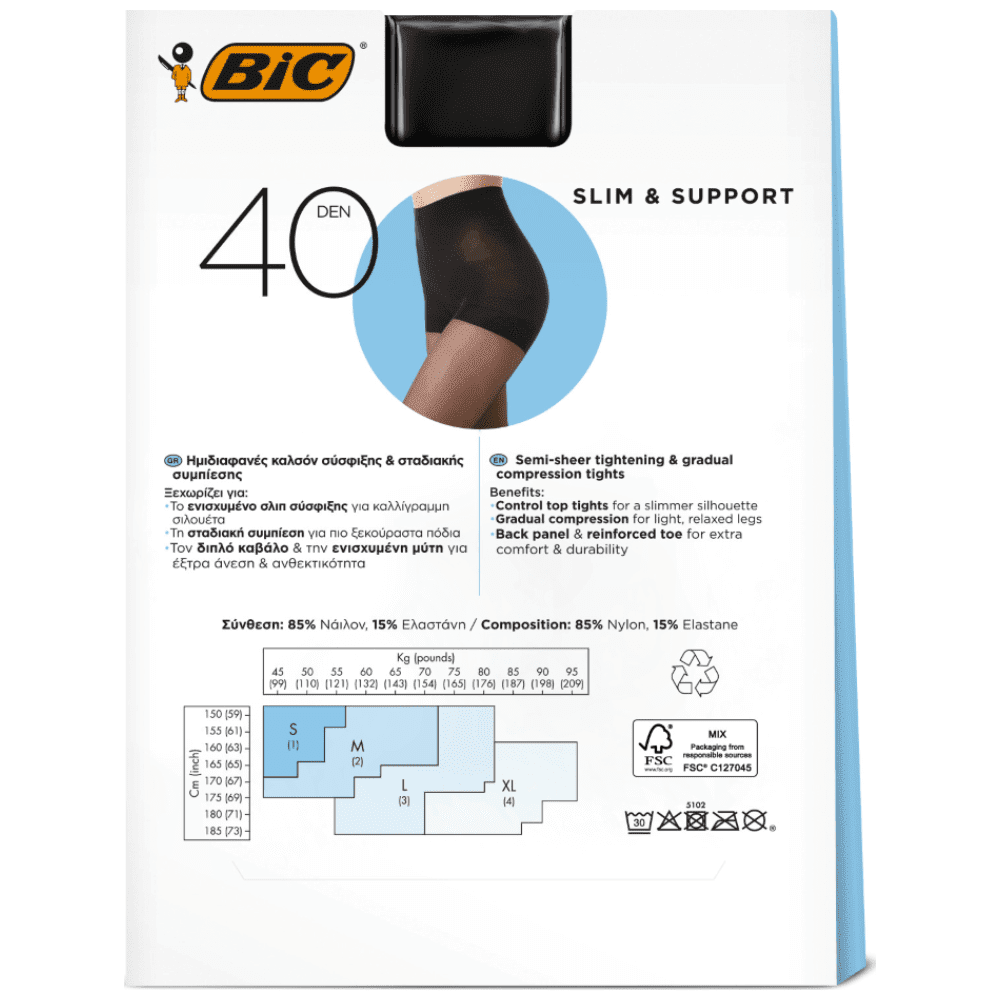 ΒΙC Καλσόν Slim&Support 40DEN - Μαύρο, Extra Large Ημιδιαφανές καλσόν σύσφιξης & σταδιακής συμπίεσης 40 DEN. Ξεχωρίζει για: Τo ενισχυμένο σλιπ σύσφιξης για καλλίγραμμη σιλουέτα Τη σταδιακή συμπίεση για πιο ξεκούραστα πόδια Τον διπλό καβάλο & την ενισχυμένη μύτη για έξτρα άνεση & ανθεκτικότητα.
