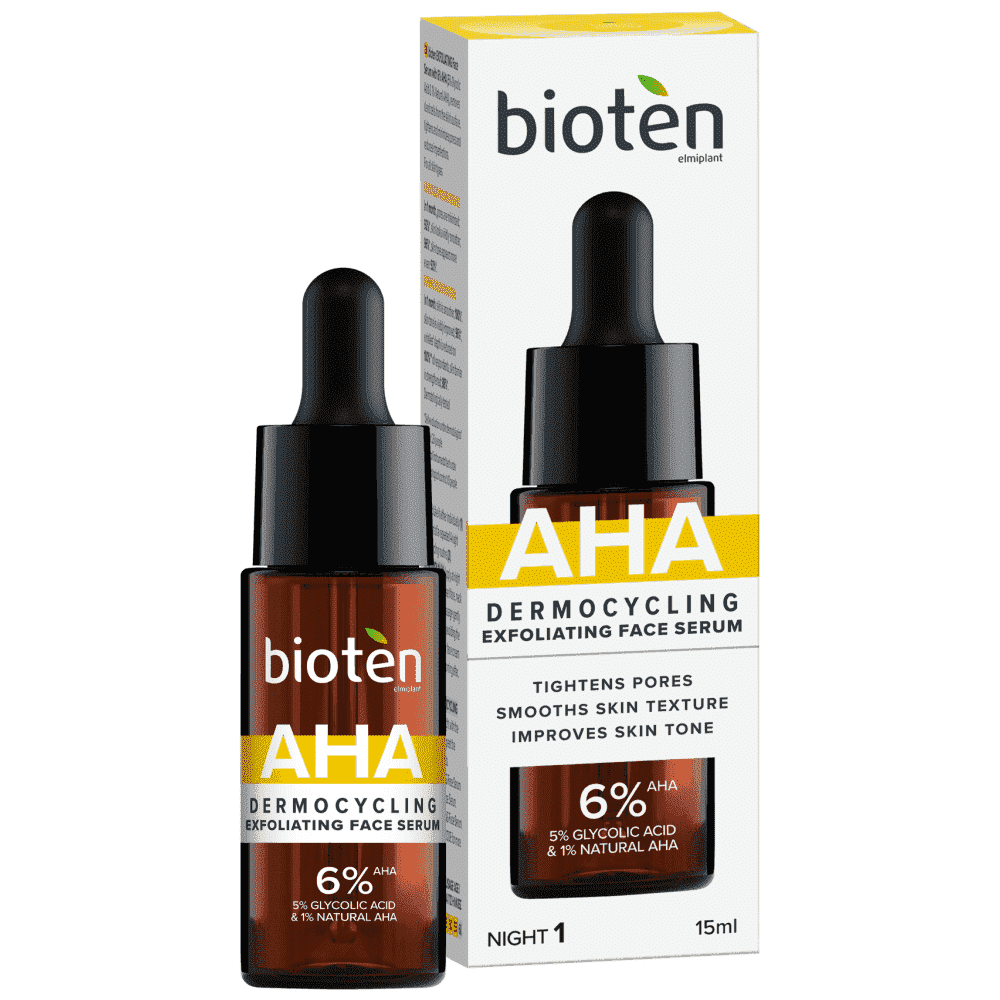 Ορός προσώπου bioten EXFOLIATING με 6% AHA (5% Γλυκολικό Οξύ & 1% Φυσικά AHA), αφαιρεί τα νεκρά κύτταρα από την επιφάνεια του δέρματος, συρρικνώνει και ελαχιστοποιεί τους πόρους και μειώνει τις ατέλειες.