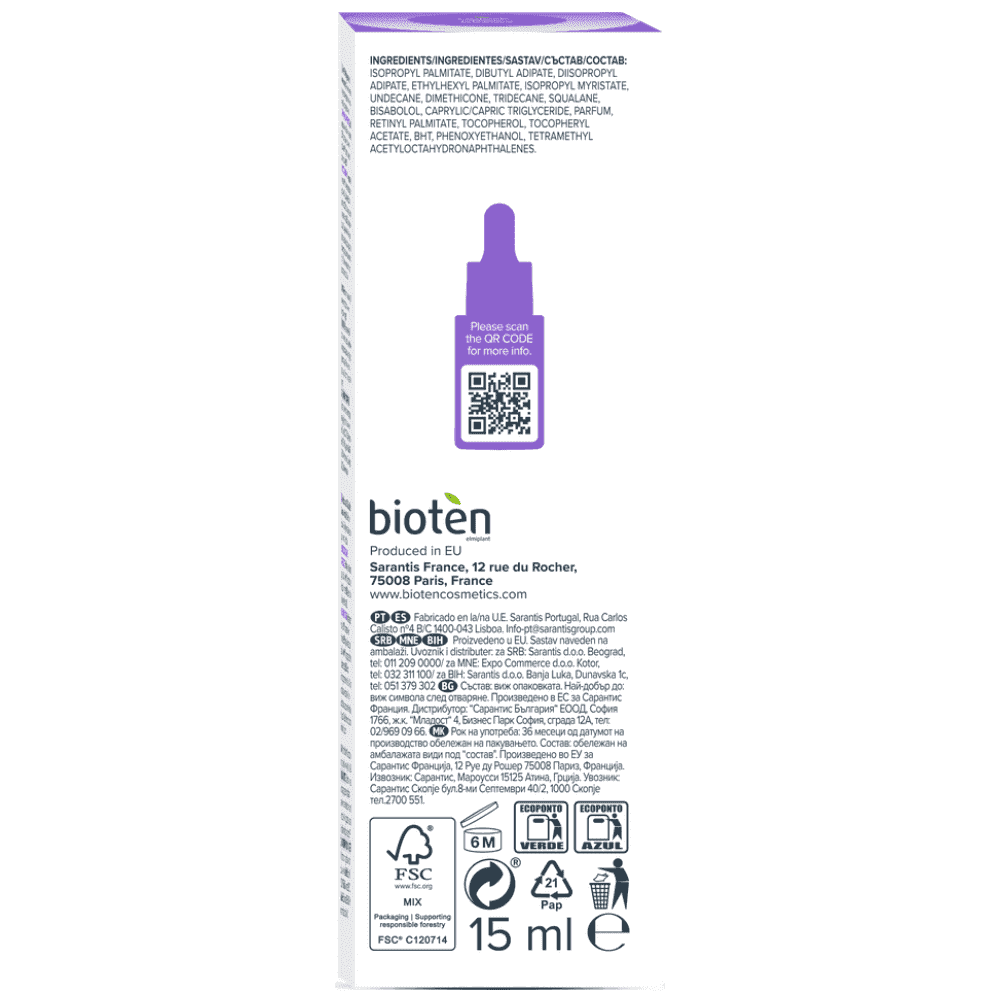 Ορός προσώπου bioten RETINOL με 1% Σύμπλεγμα Ρετινόλης (0,3% Ρετινόλη σε Σκουαλένιο και Γλυκερίνη), αναγεννά το δέρμα, μειώνει τις ρυτίδες και αυξάνει την ελαστικότητα.