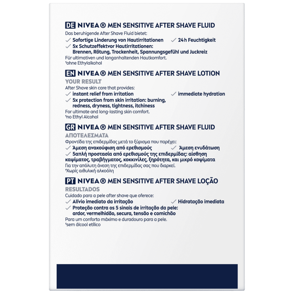 Το NIVEA MEN Sensitive After Shave Fluid είναι μια εξειδικευμένη λύση μετά το ξύρισμα για ευαίσθητη επιδερμίδα. Αυτή η λοσιόν ανακουφίζει γρήγορα τον ερεθισμό και τη δυσφορία, παρέχοντας άμεση ανακούφιση. Η πλούσια ενυδατική της σύνθεση ενυδατώνει σε βάθος, αποτρέποντας την ξηρότητα μετά το ξύρισμα. Με ελαφριά, μη λιπαρή υφή, εξασφαλίζει εύκολη εφαρμογή και αφήνει την επιδερμίδα αναζωογονημένη και καταπραϋμένη. Δερματολογικά ελεγμένη, αυτή η λοσιόν είναι μια αξιόπιστη επιλογή για μια αναζωογονητική και ευεργετική εμπειρία μετά το ξύρισμα.