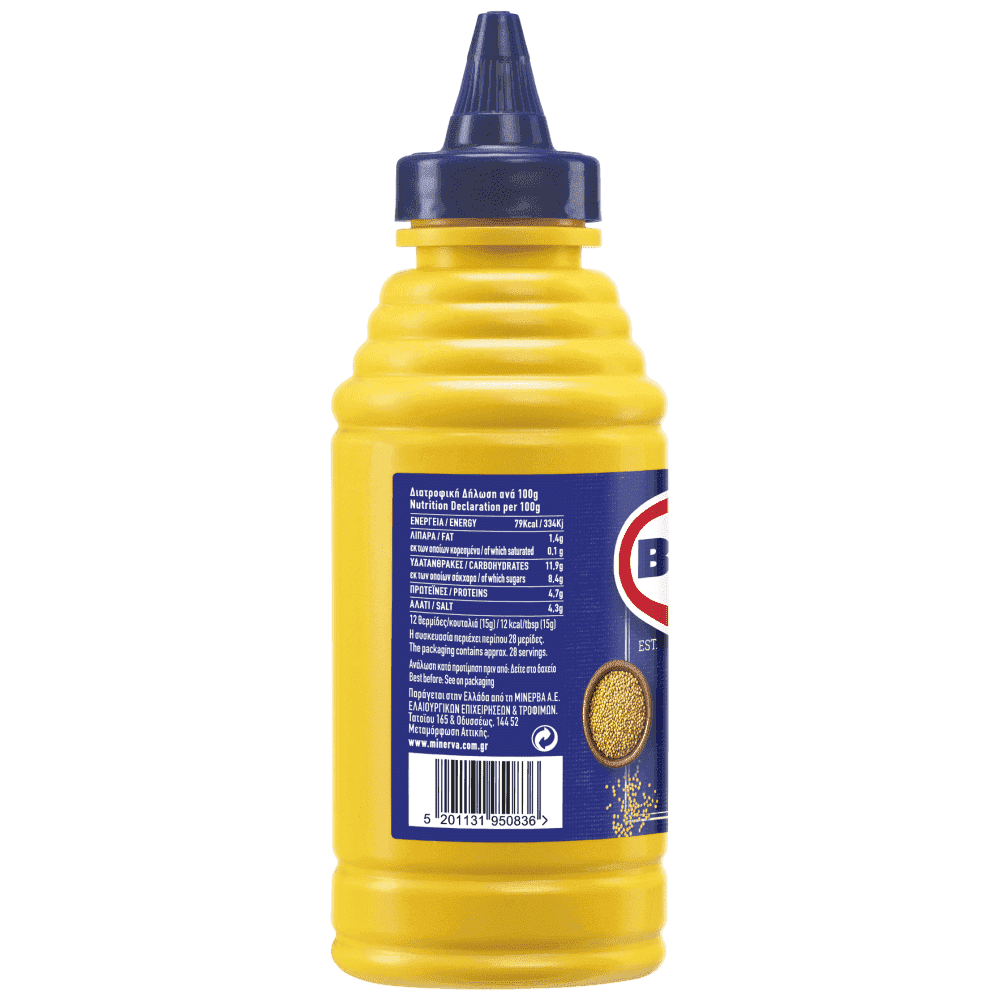Πρόκειται για προϊόν μουστάρδας που προέρχεται από την άλεση αποκλειστικά κίτρινου σιναπόσπορου. Η υφή του χαρακτηρίζεται ως λεπτή και προσδίσει γυαλάδα στο φωτεινό κίτρινο χρώμα της μάζας του. Δεν περιέχει τεχνητά χρώματα και συντηρητικά. Αποτελεί ένα όξινο προϊόν με ευχάριστη και ήπια επίγευση που μπορεί να συνοδεύεσει αρμονικά διαφόρων ειδών γεύματα καθόλη τη διάρκεια της ημέρας ενώ δεν υφίσταται κάποιος ηλικιακός περιορισμός στην χρήση του. Η συγκεκριμένη συσκευασία, η οποία αποτελεί την εξέλιξη της εμβληματικής φιάλης τύπου «μουσταρδιέρας», εξυπηρετεί μέσω της κωνικότητάς του πώματος που φέρει, όλες τις μορφές έγχυσης και απλώματος του προϊόντος που επιθυμούν οι καταναλωτές. Οι συσκευασίες σφραγίζονται με σκοπό τη διατήρηση της φρεσκάδας του προϊόντος.