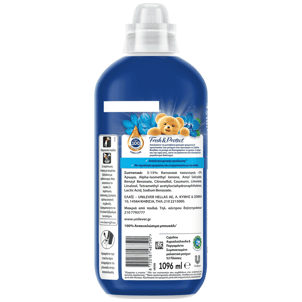 Cajoline Fresh & Protect Αγριολούλουδα & Περγαμόντο. Συμπυκνωμένο μαλακτικό ρούχων με τεχνολογία αρώματος που ενεργοποιείται με την κίνηση. Απολαύστε τη μοναδική εμπειρία αρώματος & προστασίας των ρούχων που προσφέρει το Cajoline. Βοηθάει τα ρούχα να διατηρήσουν το χρώμα, το σχήμα και την υφή τους, ώστε να φαίνονται σαν καινούρια για μεγαλύτερο διάστημα. Έως 100 ημέρες αρώματος* Fibre Care. Αποτελεσματικό σε σύντομο κύκλο και χαμηλές θερμοκρασίες. Απαλότητα φυτικής προέλευσης 100% Ανακυκλώσιμο μπουκάλι *Βάσει εργαστηριακής αξιολόγησης. Αποθήκευση στη ντουλάπα μετά από πλύσιμο. Αξιολόγηση του αρώματος μετά από ενεργοποίηση μικροκαψουλών. 70% των συστατικών που συμβάλλουν στην απαλότητα είναι φυτικής προέλευσης. Εξαιρείται η ετικέτα